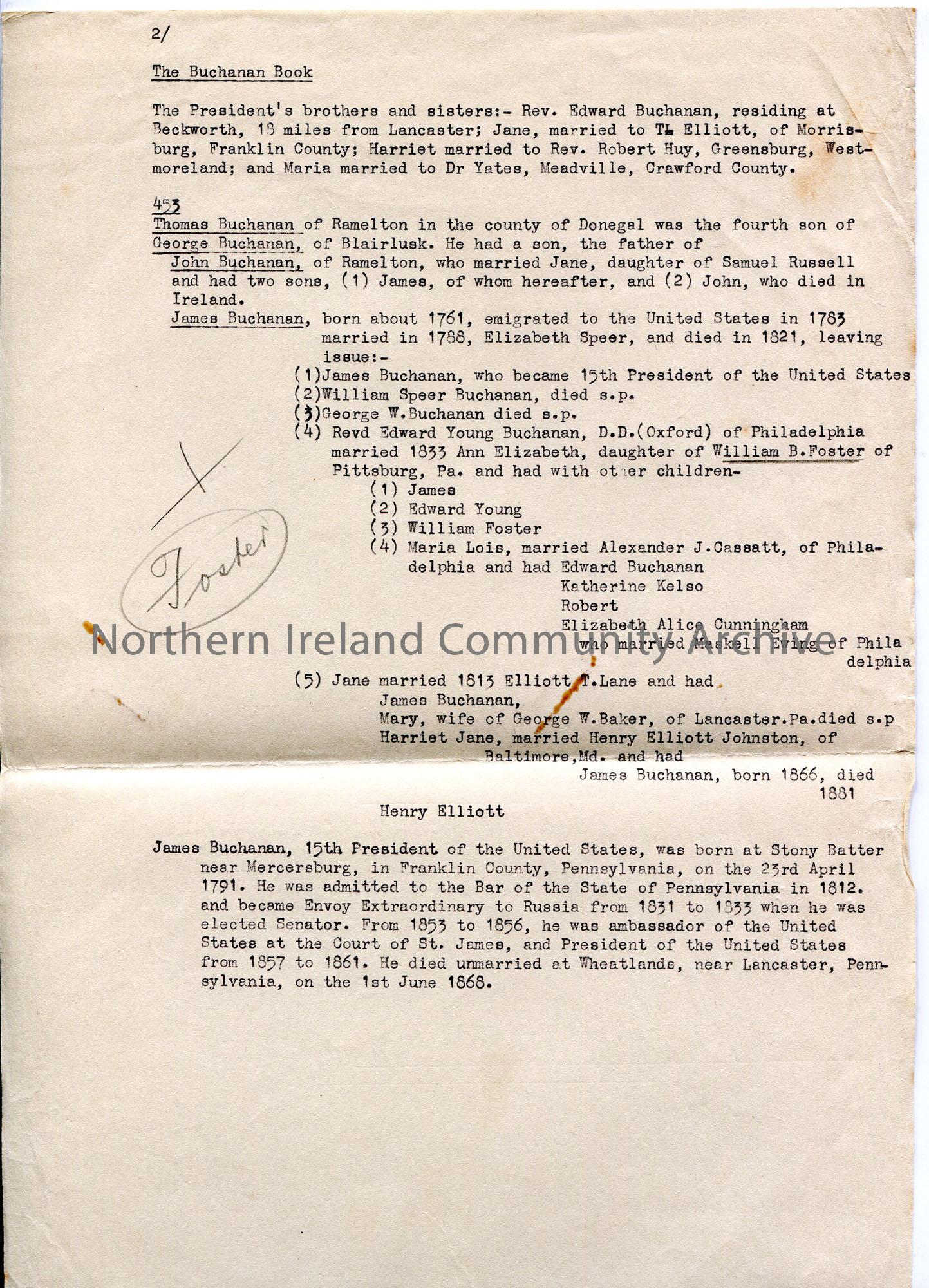 Page 2 of 2. Typed extracts from ‘The Buchanan Book’. The surname Foster is handwritten in pencil and circled on page 2.