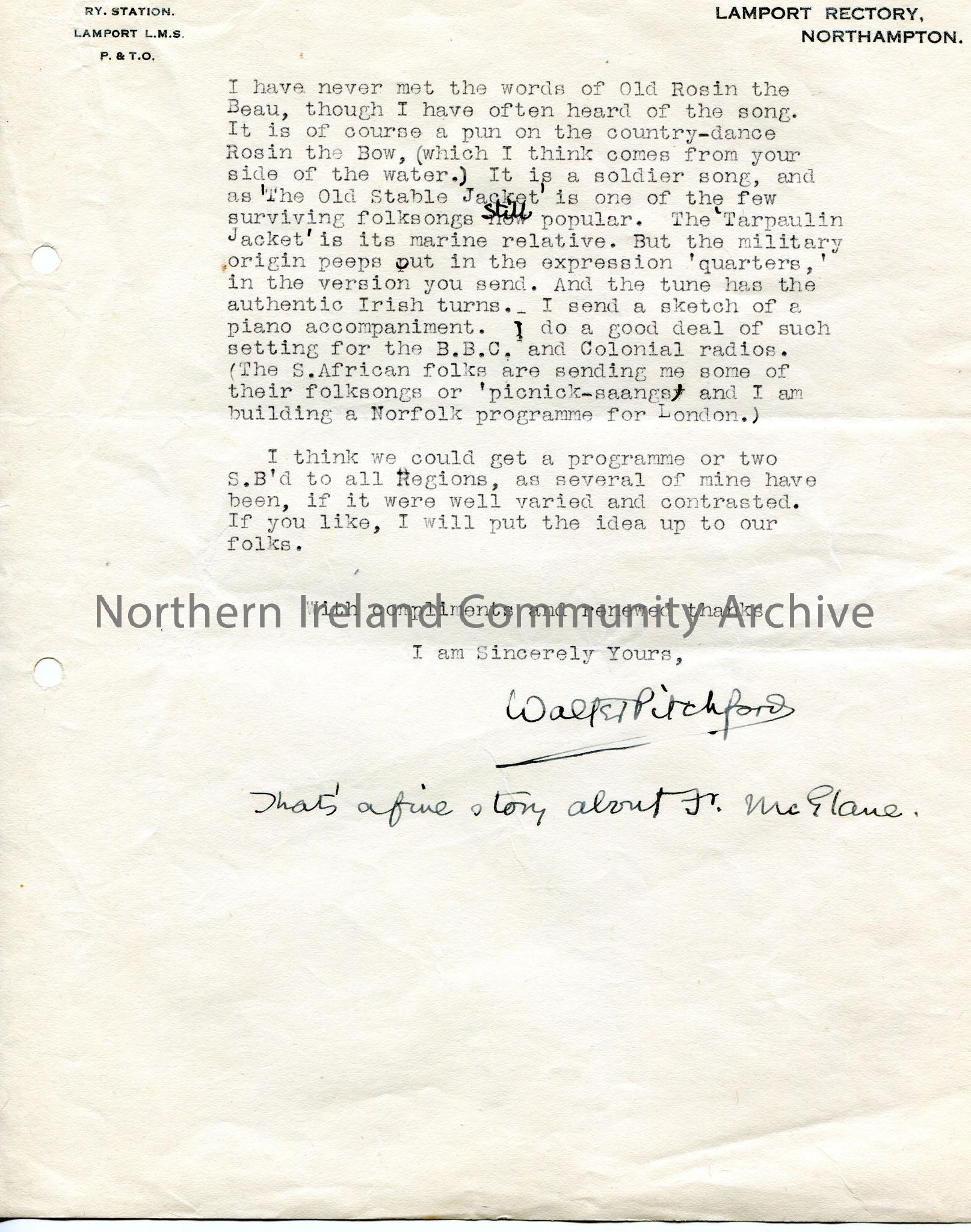 Page 2 of 2. Typed letter to Mr Henry. Wishes to subscribe to the 'Northern Constitution'. Thanks Sam to sending a version of 'Dreary Gallows'. Asks Sam for the tune 'As I was going to Old Athy'. Discusses various folk songs. Encloses sketch of a piano accompaniment. Suggests making a programme with Sam for broadcast.