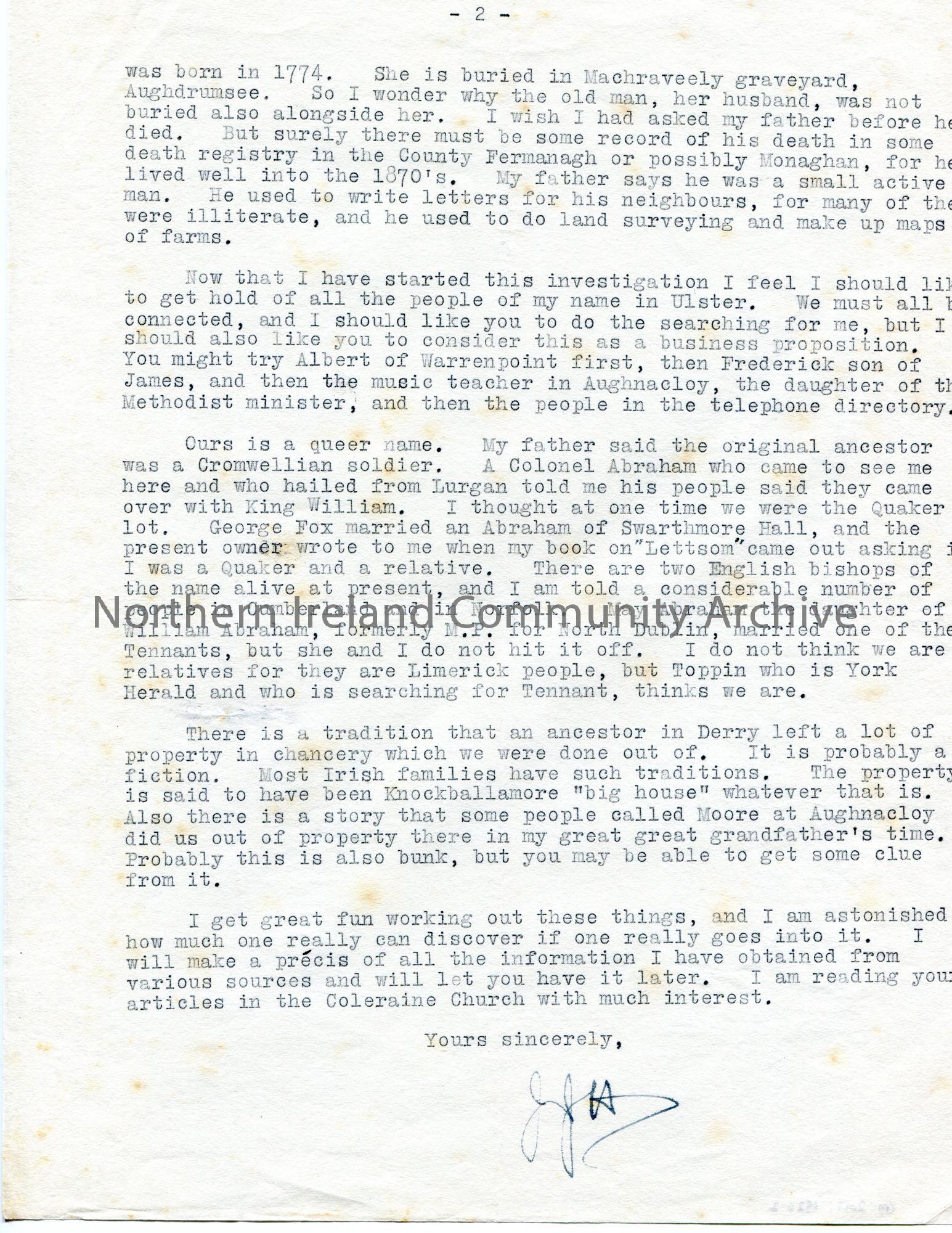 Page 2 of 2. Typed letter to Sam Henry. Thanks Sam for his help with conducting research into his family tree. Provides detailed information on his relatives. Requests from Sam that he contact all those in Ulster with the family name of Abraham which he considers a 'business proposition'. He enjoys reading Sam's articles on the 'Coleraine Church [Chronicle]' interesting. The sender has made amendments to the letter in ink.