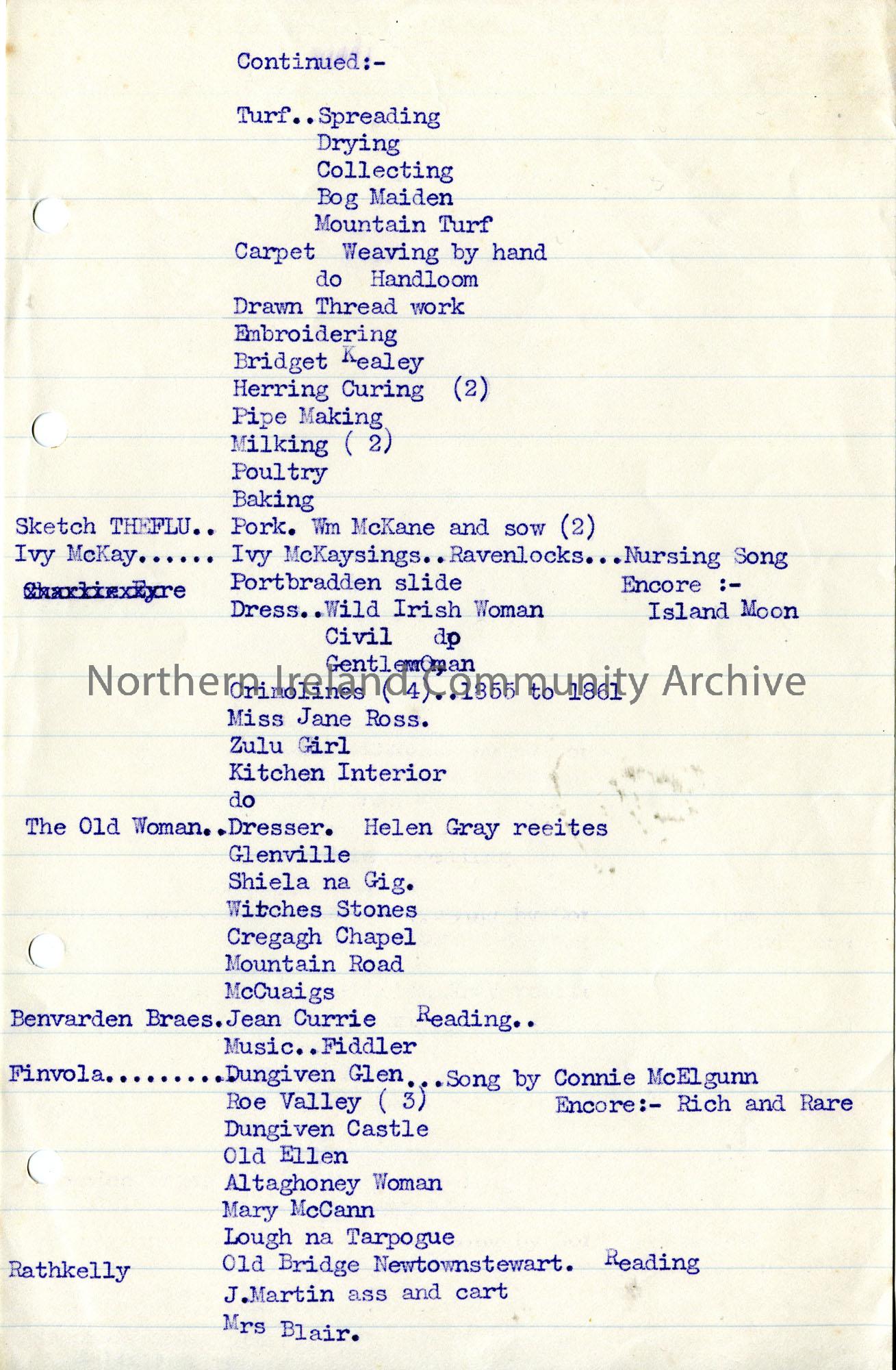 Page 2 of 2. Typed list of slides for St. Patrick's Women's Bible Class. Slides are categorised under 'Bible Women; Carol & 3 slides; Soldier Boy; Charlie Eyre; Ballyeamon Song; Turf; Sketch THE FLU; Ive McKay; The Old Woman; Benvarden Braes; Finvola; Rathkelly.