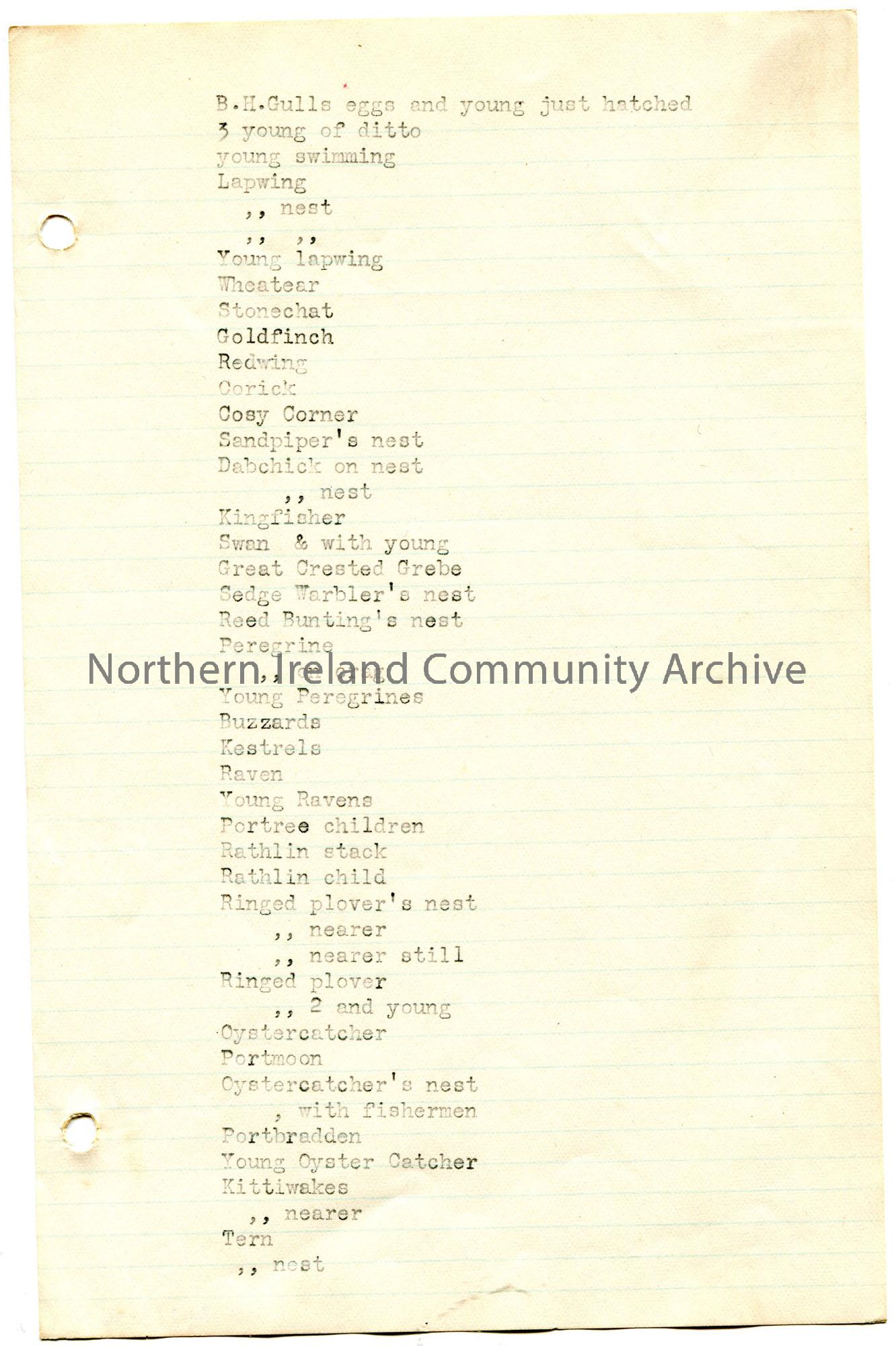 Page 2 of 2. Typed list of slides re birds for possible lecture or talk in Castlecaulfield on 20th December 1922. Begins with 'B. H. Gulls eggs and young just hatched' and ends with ',, nest' on page 2.