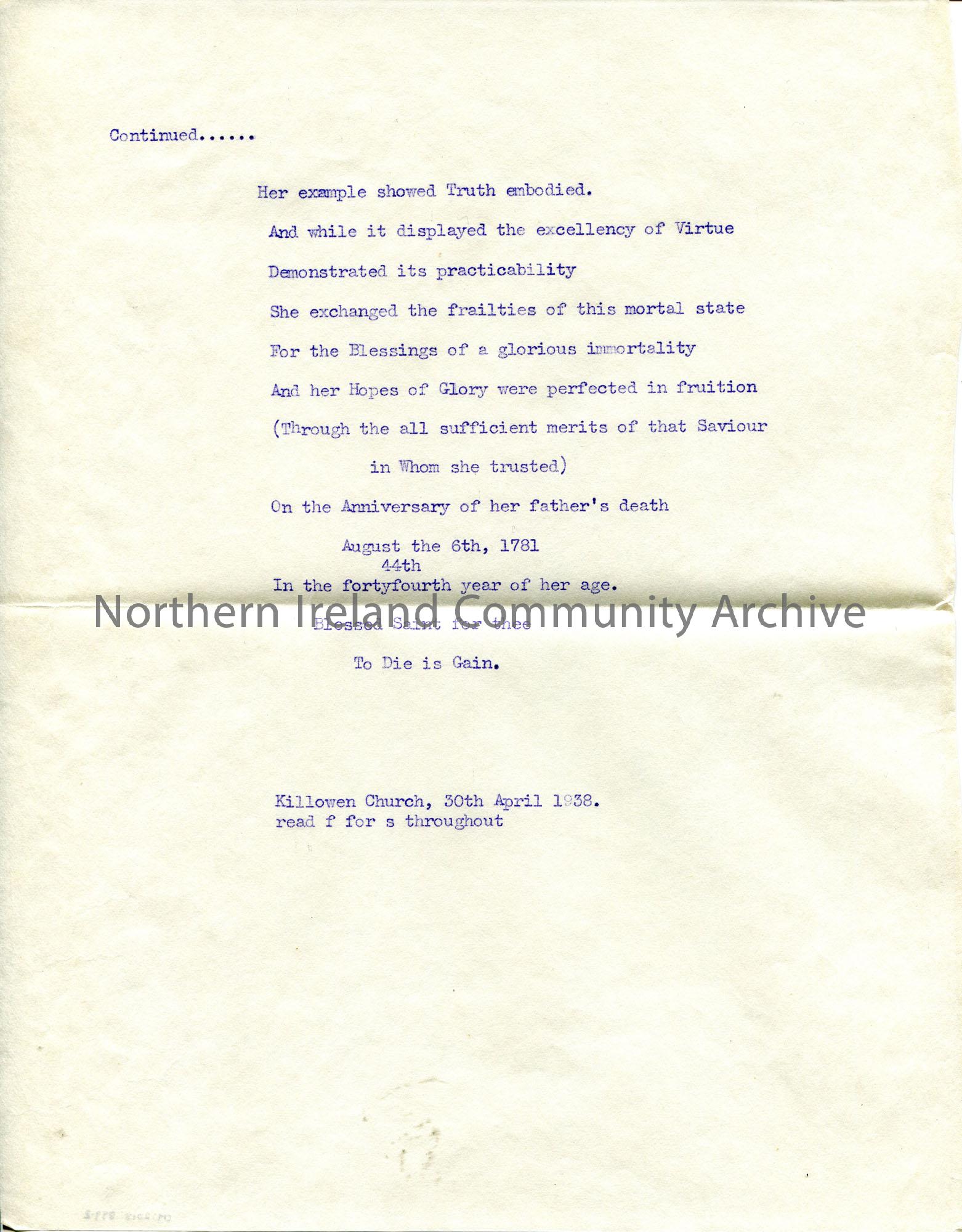 Page 2 of 2. Typed memorial of Anne Jackson, wife of Right Honourable Richard Jackson of Jackson Hall. Taken from Killowen Church on 30th April, 1938.