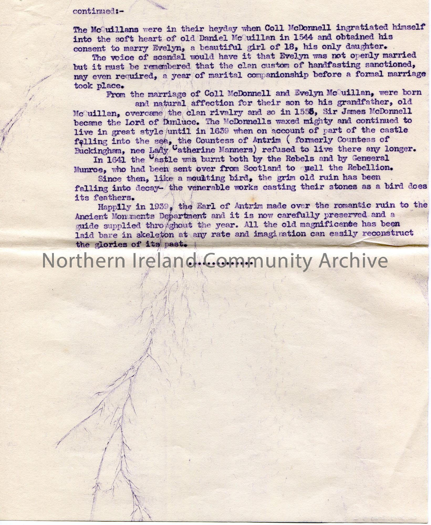 Page 2 of 2. Typed notes for draft of Sam Henry's book 'Dunluce and Giant's Causeway'. Titled, 'Chronology of Dunluce'.