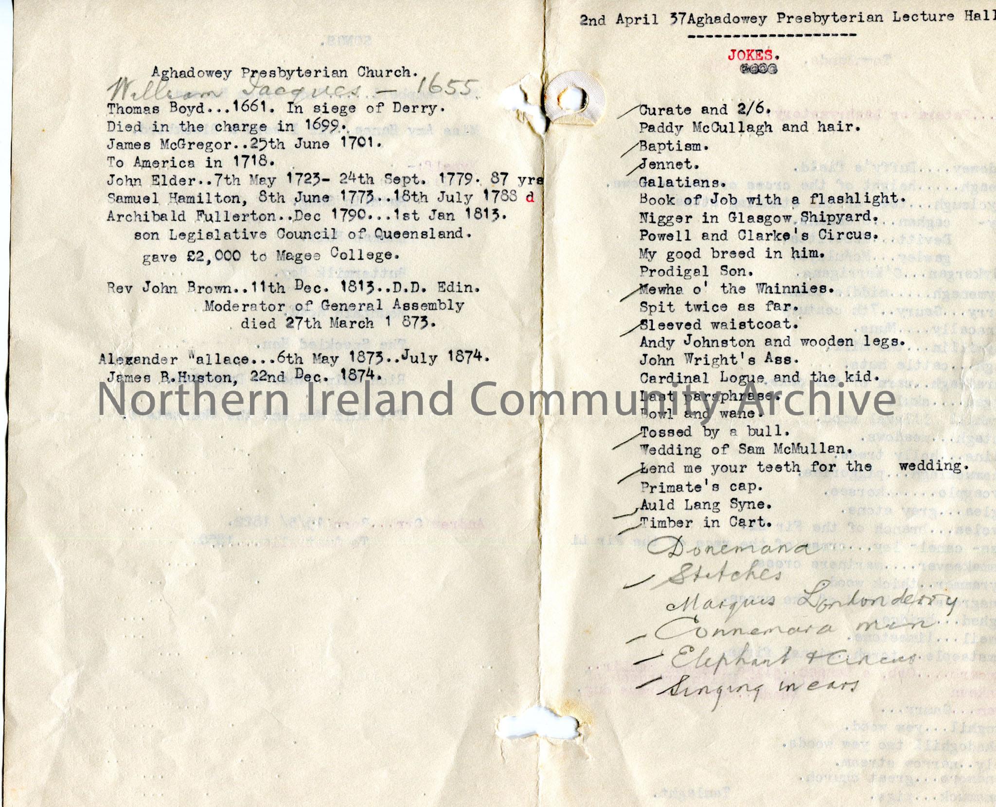 Page 2 of 2. Typed notes (landscape) re lecture at Aghadowey Presbyterian Hall on 2nd April, 1937. Typed and handwritten list of names of jokes. Typed…