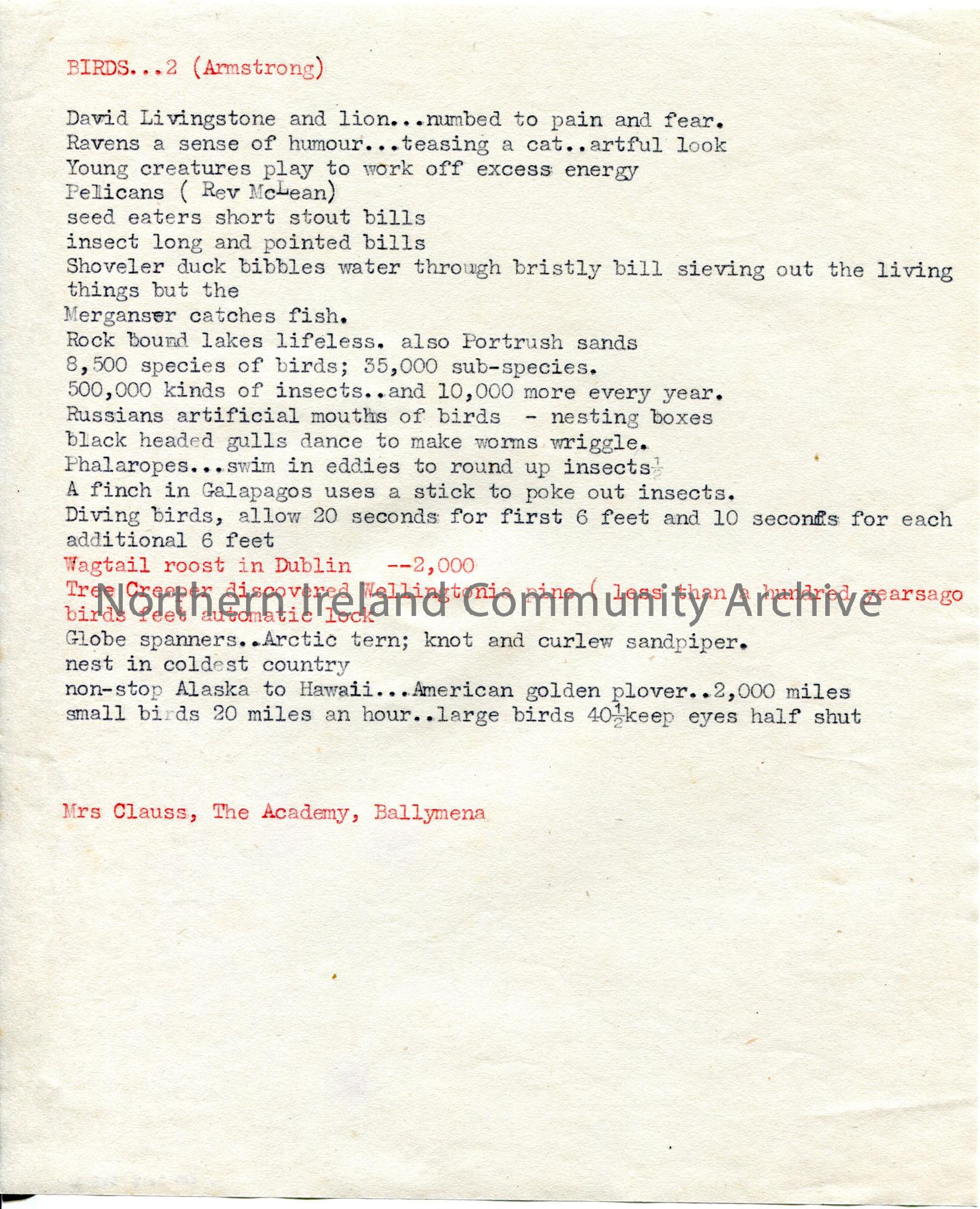 Page 2 of 2. Typed notes re birds taken from a book titled, ‘BIRDS by E. A. Armstrong. Z 2376..Linenhall Library’.