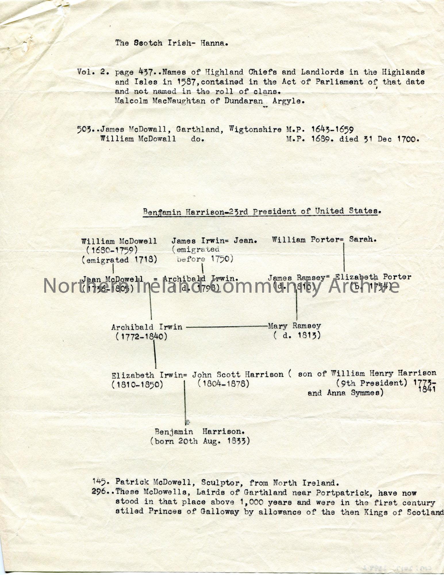 Page 2 of 2. Typed notes taken from 'The Scotch Irish - Hanna - Volume 2'. Re Scottish settlers in Ireland and America. Includes Presidents of the United States and family tree of Benjamin Harrison - 23rd President of America.