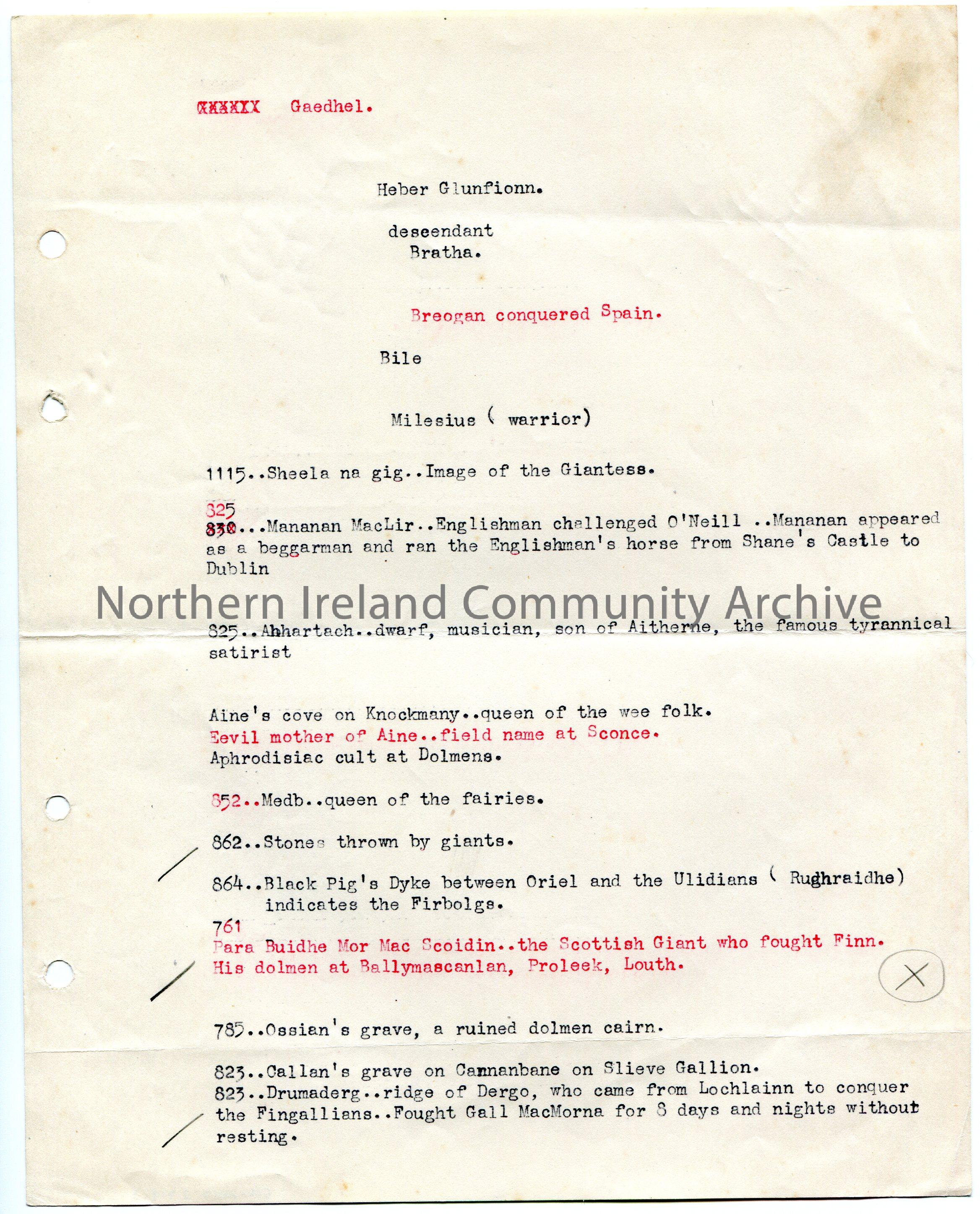 Page 2 of 2. Typed notes titled, ‘Borlase Vol. III’. Pencil marks beside some of the notes. Some notes are typed in red ink.