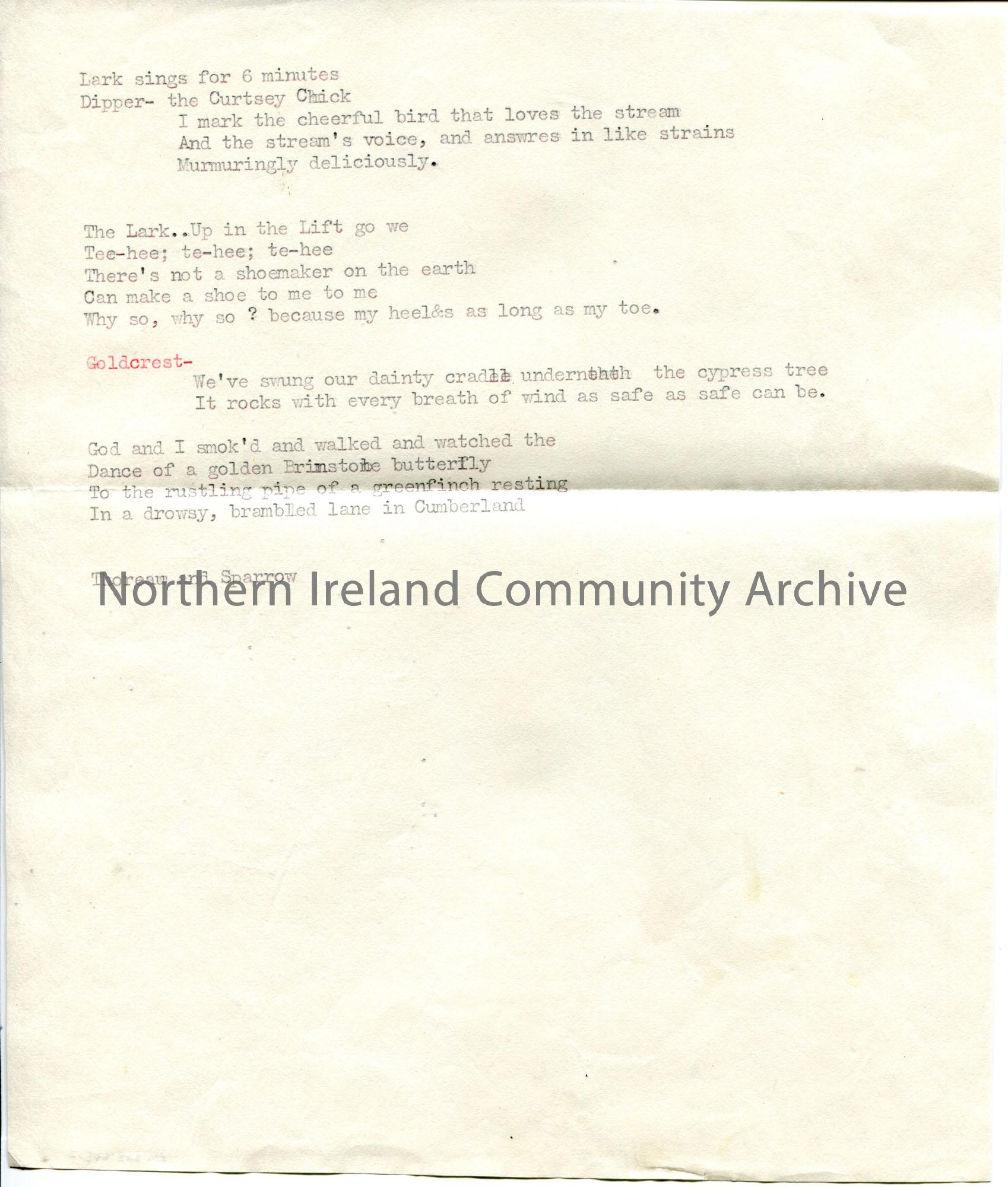 Page 2 of 2. Typed notes titled, ‘Cuckoo(s Notes’. Re birdsong.