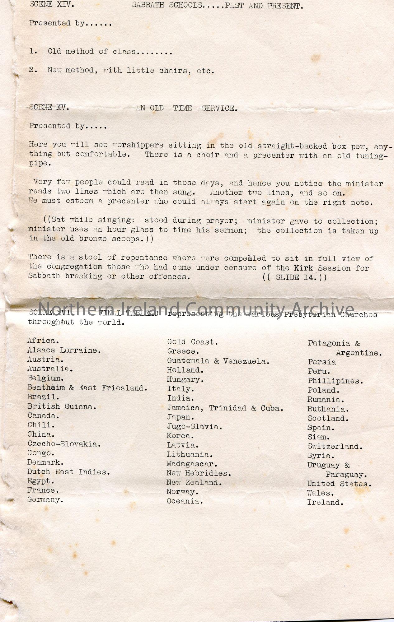 Page 2 of 2. Typed play with details of scenes, 17 in total. Three pages attached together with glue/paste. Re ancient history and Christianity. – scan069e