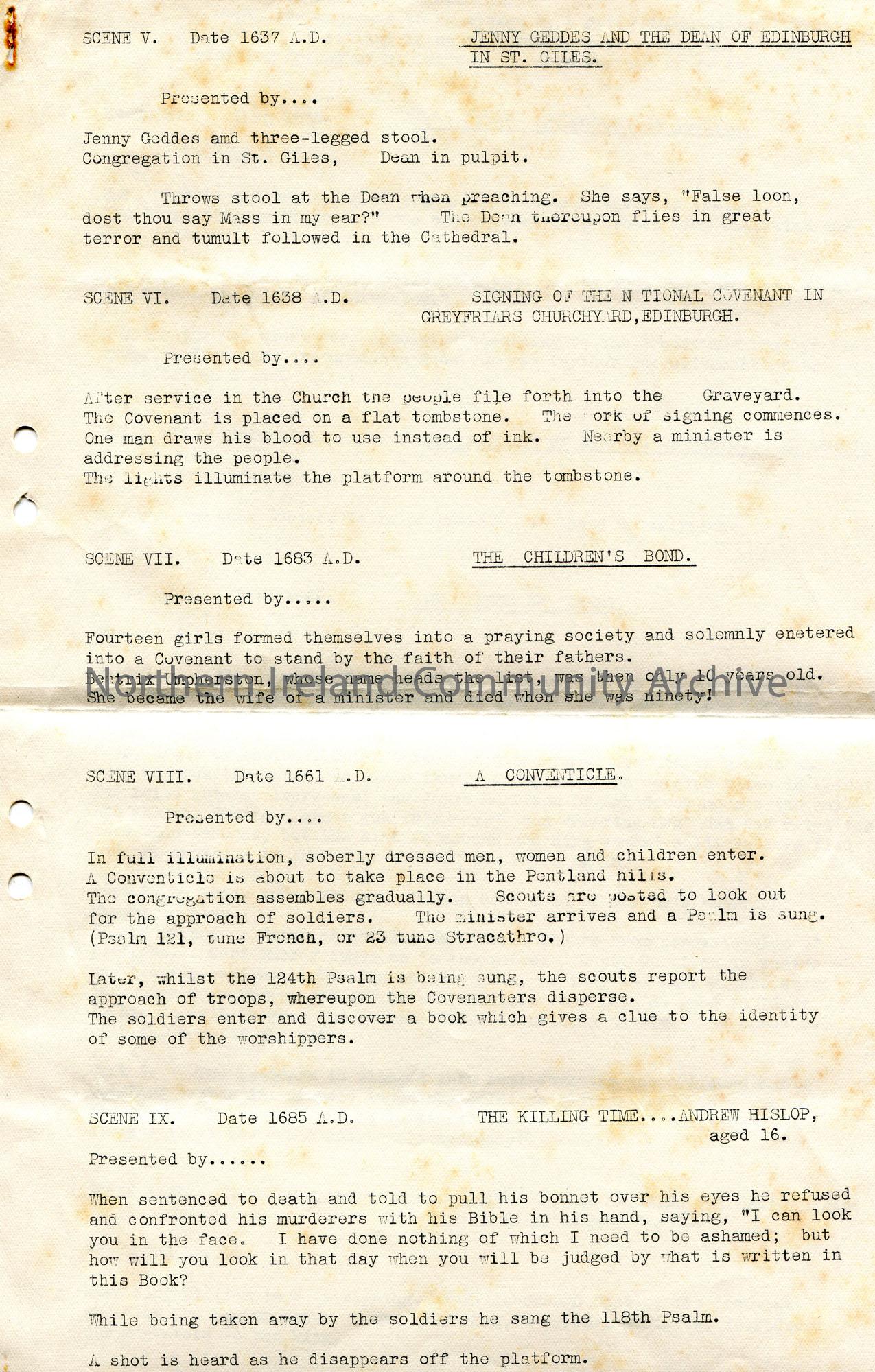 Page 2 of 2. Typed play with details of scenes, 17 in total. Three pages attached together with glue/paste. Re ancient history and Christianity.