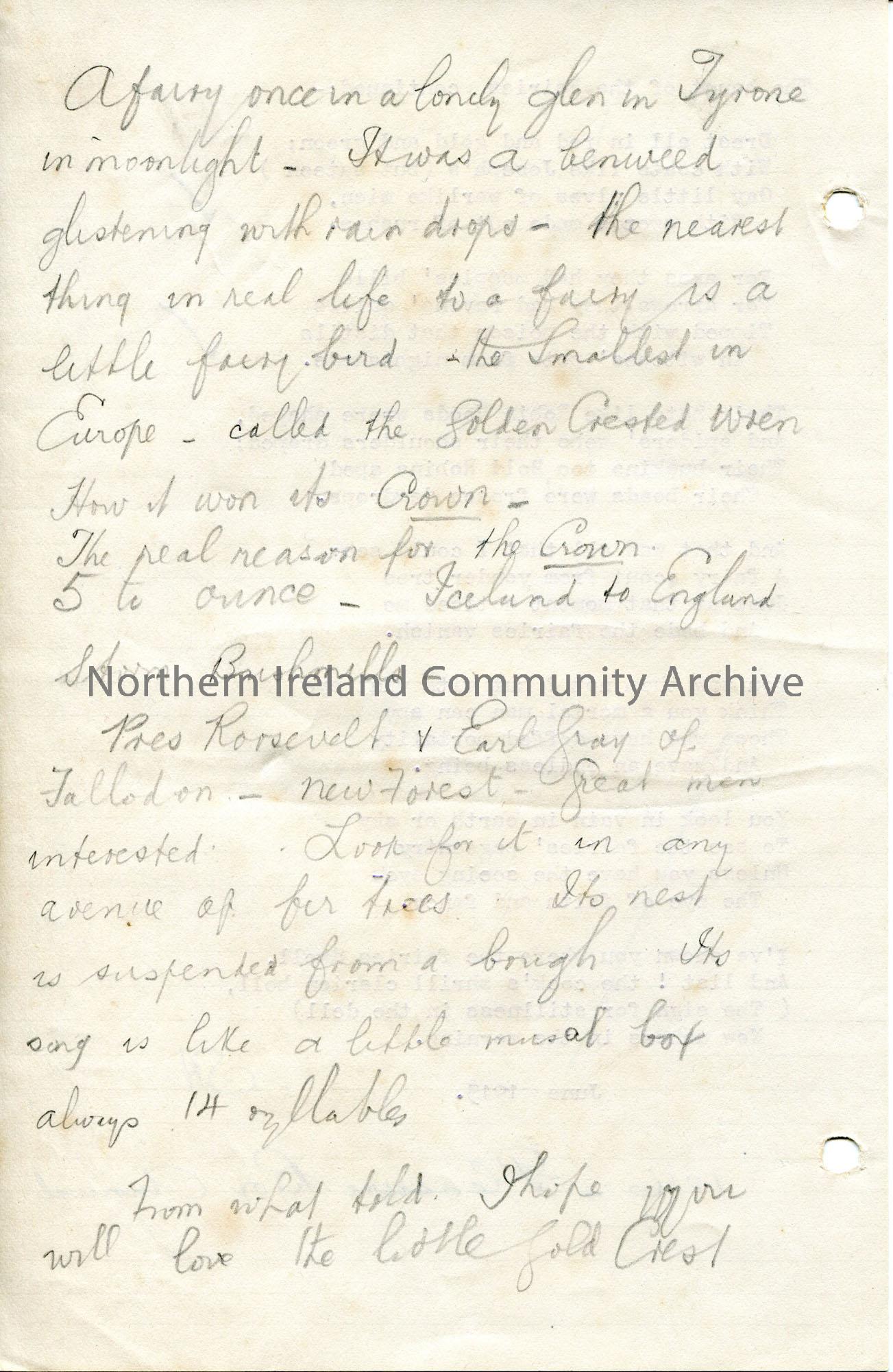 Page 2 of 2. Typed poem or words to song titled, 'The Haunt of the Fairies' by Sam Henry, June 1915. '10/6 Pleasure Box Annual' handwritten at bottom of page. Some verses and words have been scored through. Handwritten notes or verses on back of page re fairies and golden crested wren.
