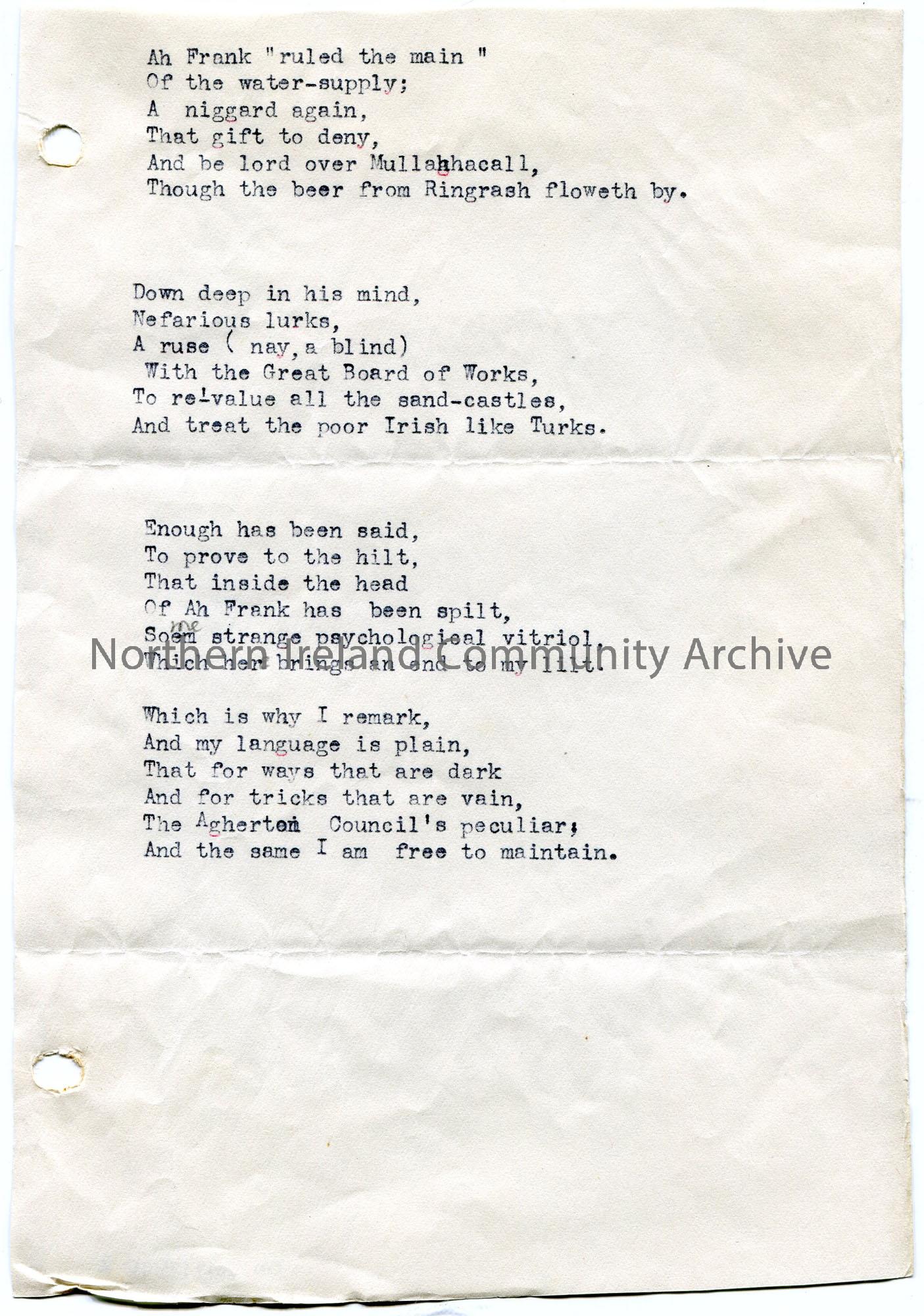 Page 2 of 2. Typed poem. Untitled. Re a man named Frank. Mentions Agherton Council.