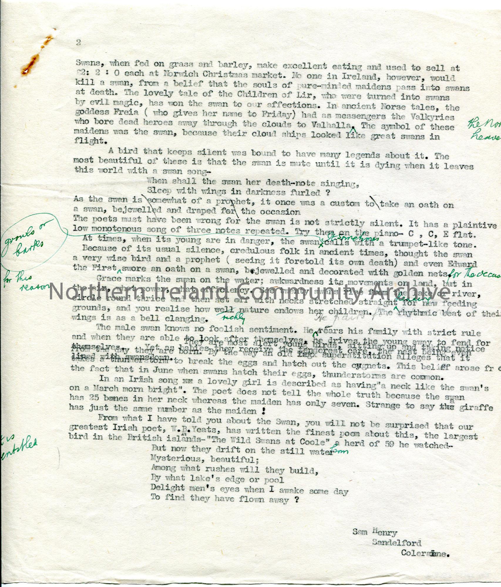 Page 2 of 2. Typed (rough) article titled, 'The Swan' by Sam Henry, Sandelford, Coleraine. Details its origins in Ireland; its characteristics and behaviours. Concludes with a poem re the swan by W. B. Yeats. Article if annotated in green pen throughout.