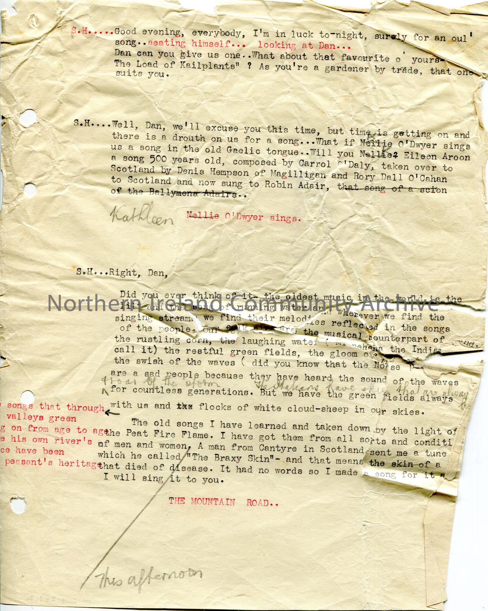 Page 2 of 2. Typed script for an Irish Ceilidh for St. Malachy’s Dramatic Club in Coleraine Town Hall, 19th December, 1933. Mentions Dan McNabb, Joe G…