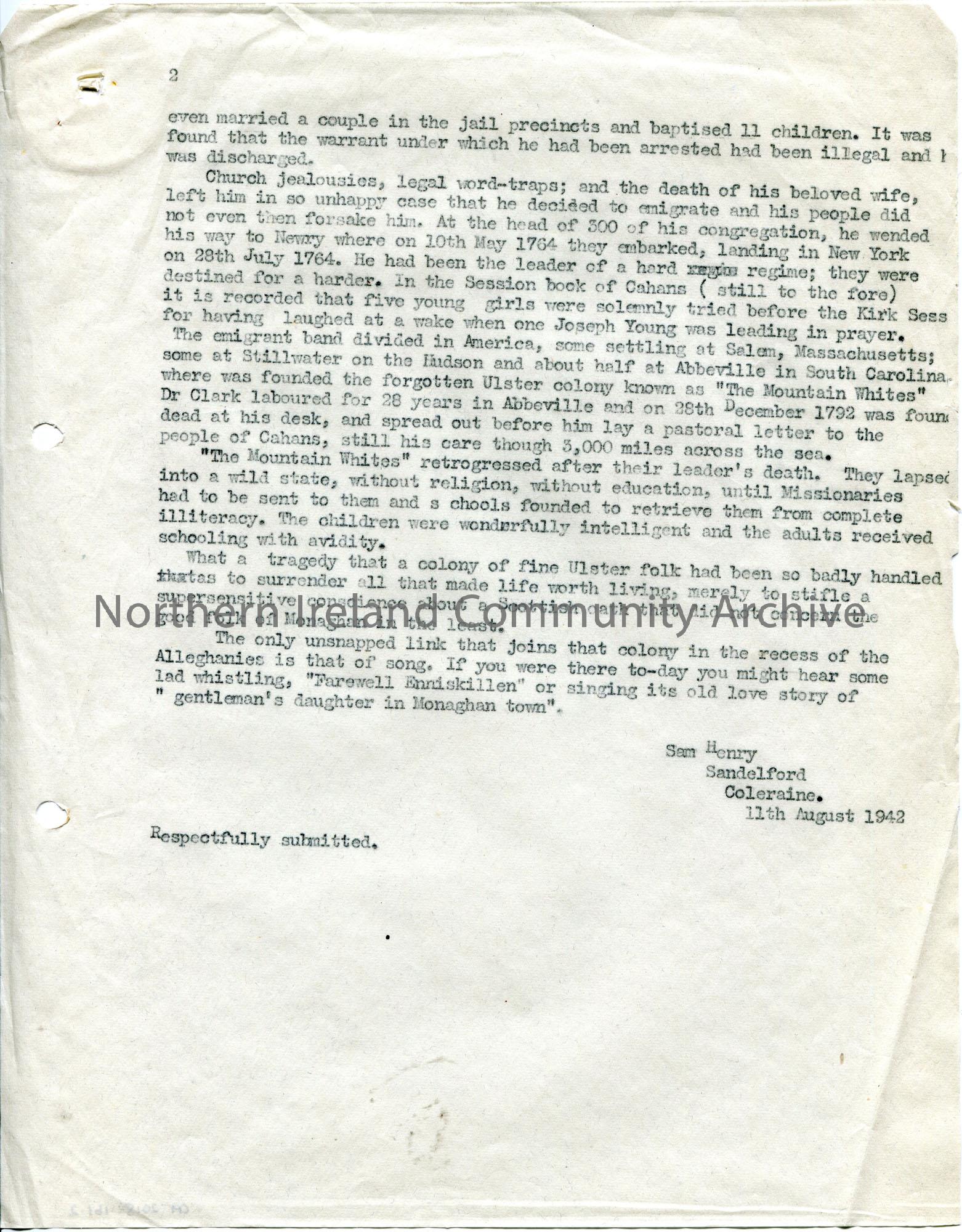 Page 2 of 2. Typed story for submission by Sam Henry on 11th August 1942 titled, 'The Mountain Whites. A Forgotten Ulster Colony in Carolina'. Re the emigration of Rev. Thomas Clark of Monaghan on 10th May 1764 from Newry to New York.