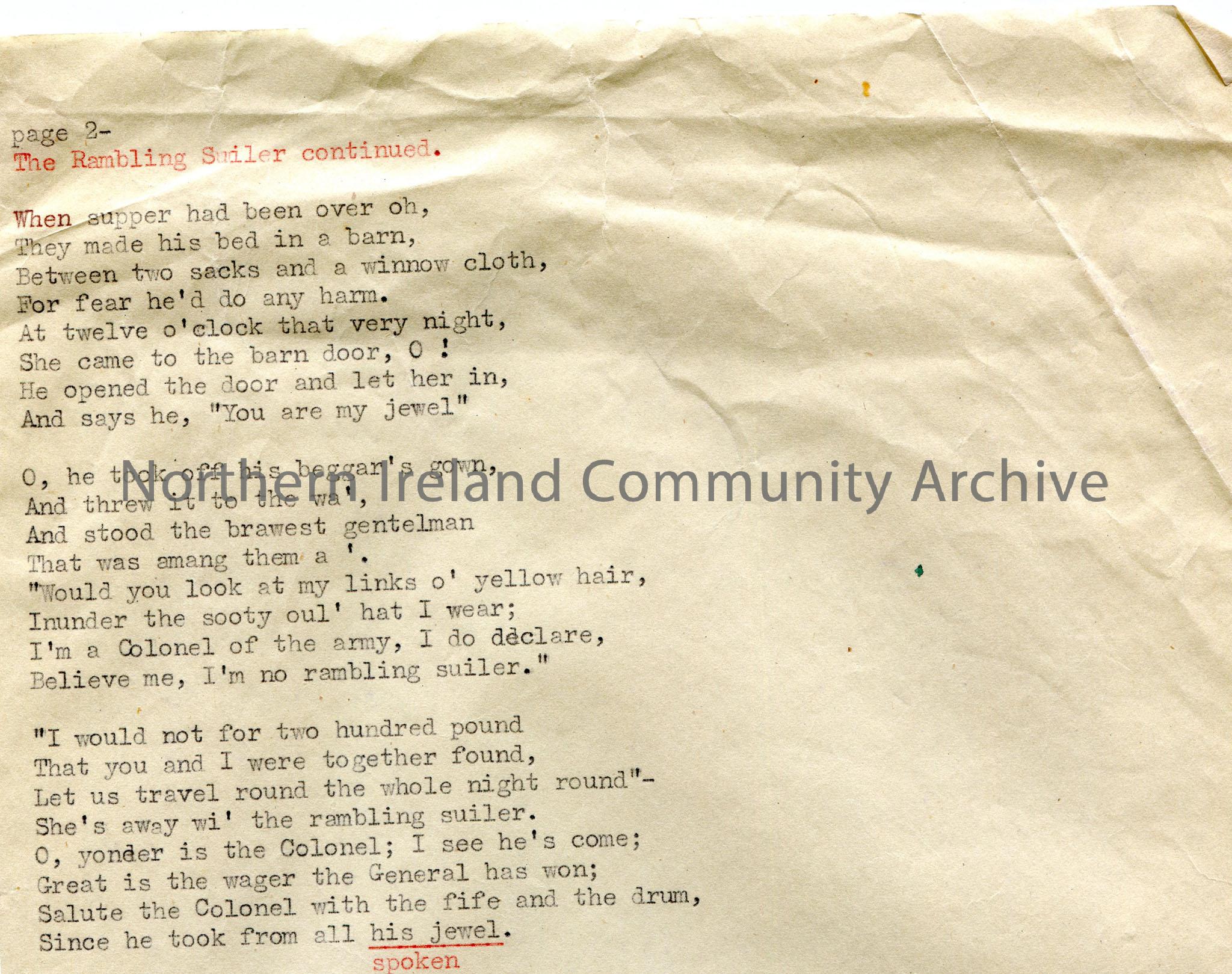 Page 2 of 2. Typed tonic sol-fa notation and words to song titled, ‘No. 183 – The Rambling Suiler’. Collected from a native of Castlewellan district, …