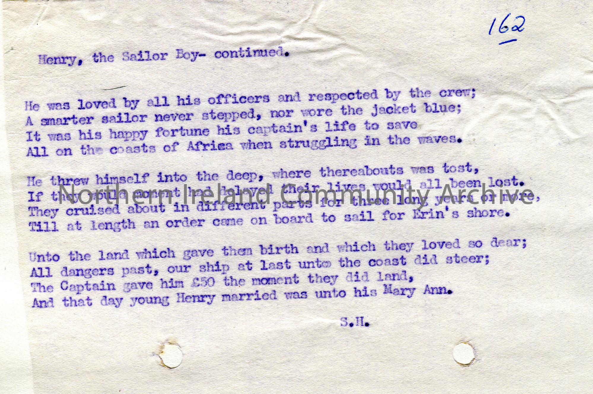Page 2 of 2. Typed tonic sol-fa notation and words to song titled, 'No. 37 - The Sailor Boy'. Air 'The River Roe'. Words from Mary Getty of Long Commons, Coleraine who learnt it from her grandmother Sally McConaghy of Dunaghy, Ballymoney. See notes re the song title and William Allingham, poet and Controller of Customs at the port of Coleraine in 1853 who later worked for Spectator magazine.