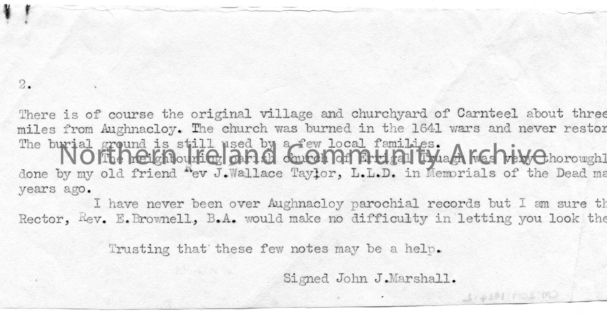 Page 2 of 2. Typed up notes from a letter from J.J. Marshall to Sam Henry on 23rd July, 1940 re his research into the family tree of James Johnston Abraham. Mentions Joseph Abraham, James Abraham, Miss Janie Abraham. Mentions their settlement in Carnteel and Aughnacloy.