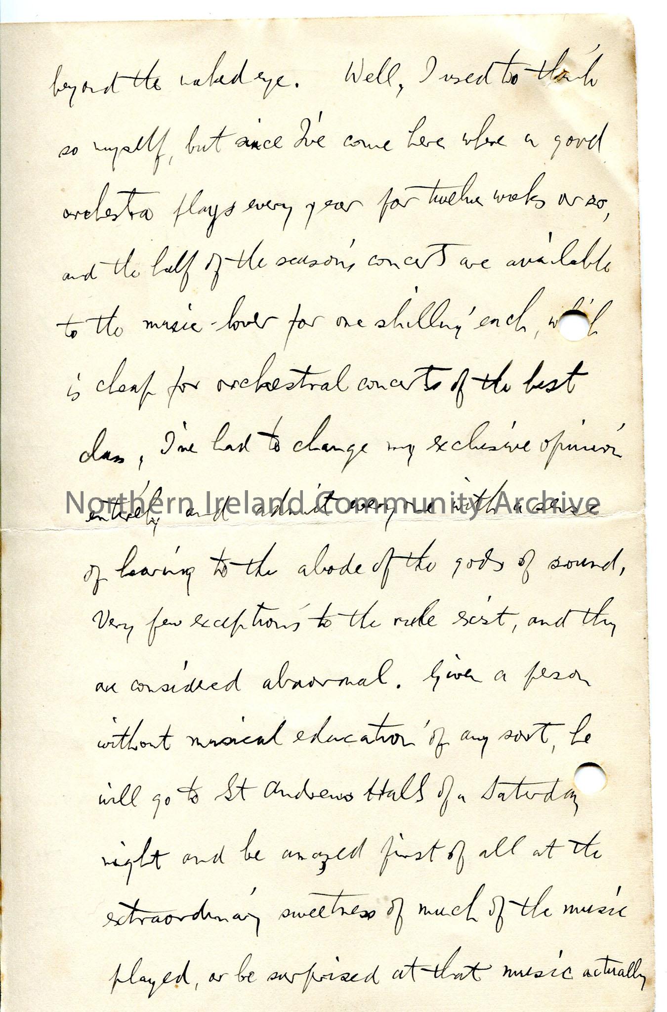 Page 2 of 24 page handwritten letter, on both sides of paper - author appears to have left Coleraine and now live in Glasgow. Mentions Irish Society School. Writes about classical music, Ibsen plays, a fanciful sketch his own, and Irish theatre, writers and myths and legends.