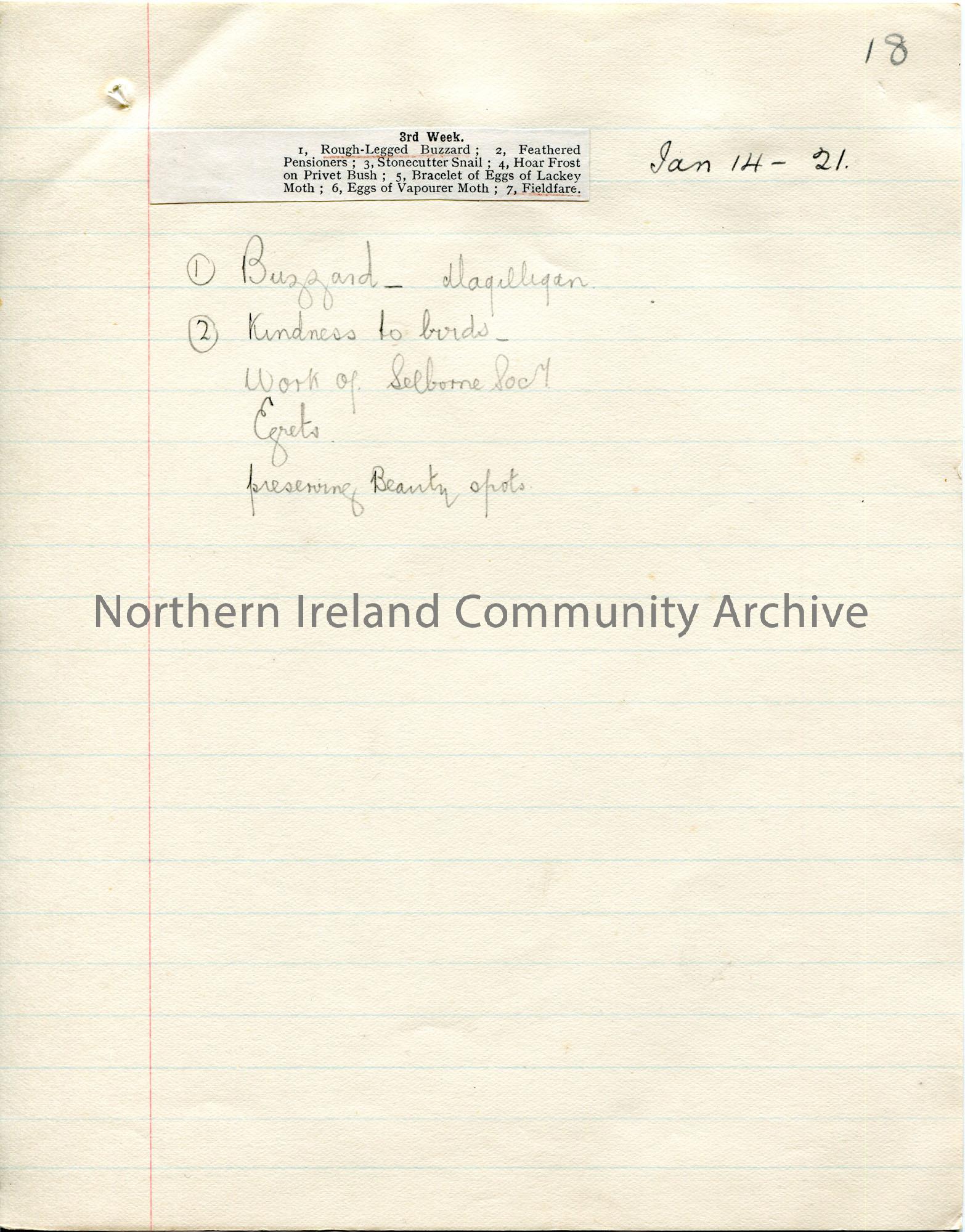 Page 2 of 26. Handwritten nature notes (double sided). Details correspond to each week of the year. Small cuttings from a publication are pasted to so…