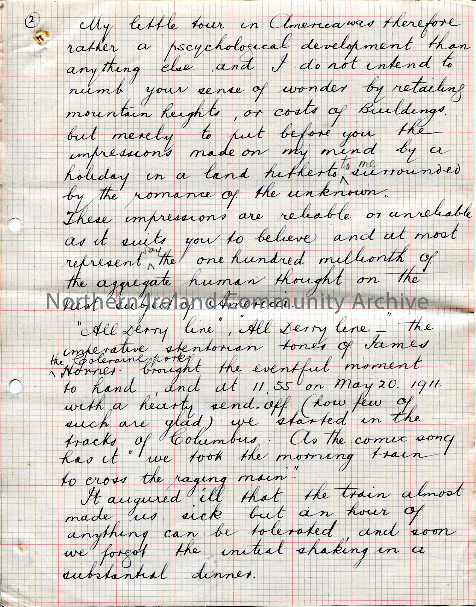 Page 2 of 27. Handwritten notes re Sam’s trip to America in 1911. Pages 1 and 2 are a story titled, ‘A Little Tour in America’ in which Sam writes of …