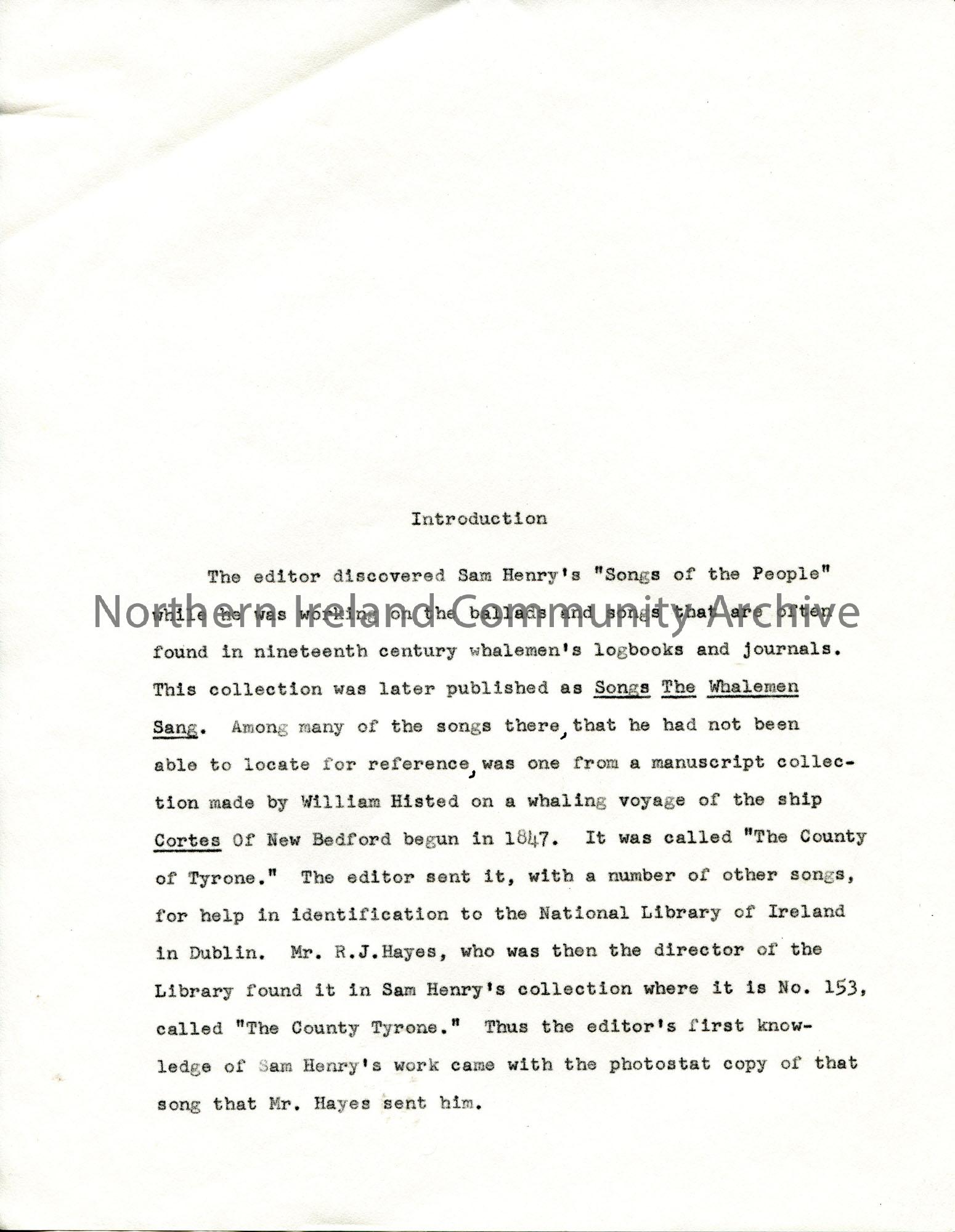 Page 2 of 28. Typed manuscript for Sam Henry's Songs of the People edited by Gale Huntington. Annotated in black ink. Includes the introduction, text re Child Ballads, Laws Ballads, Other Ballads, Songs and Ballad-Like Songs, Chanteys, Lullabys and Signing Games, Bibliography and Index.