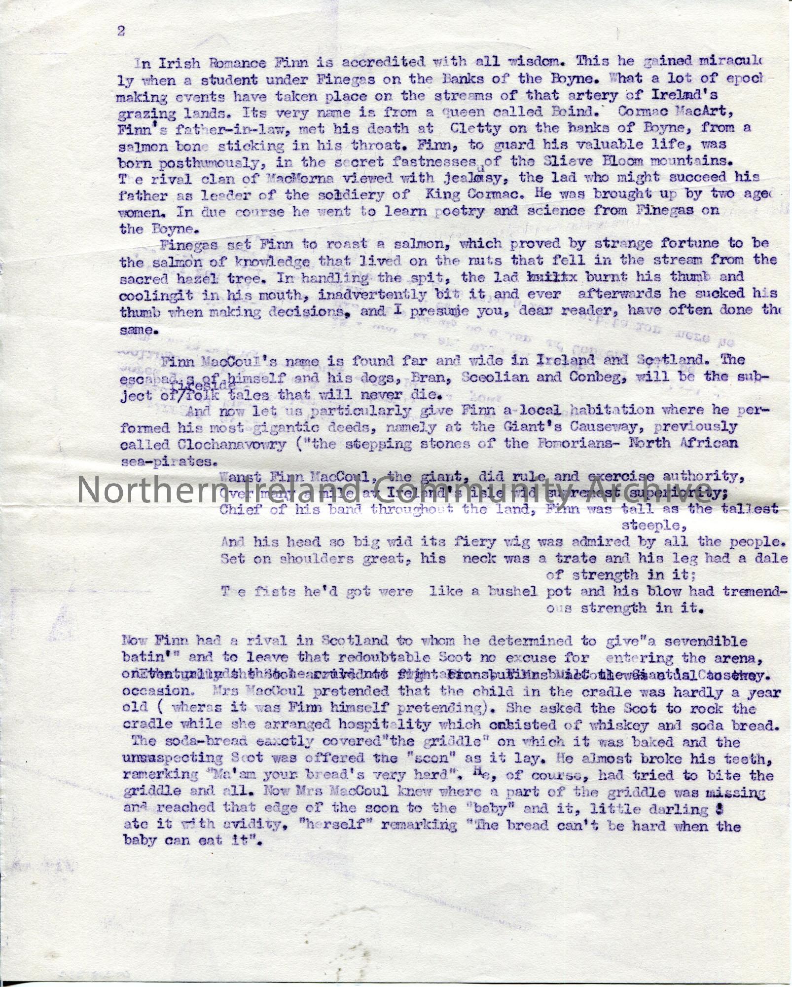 Page 2 of 3. A carbon copy of typed text for Sam Henry's book 'Dunluce and Giant's Causeway'. Typed draft version. Titled, 'Finn MacCoul. The Giant who built the Causeway'. One of a bundle of documents in draft form in the making of the book.