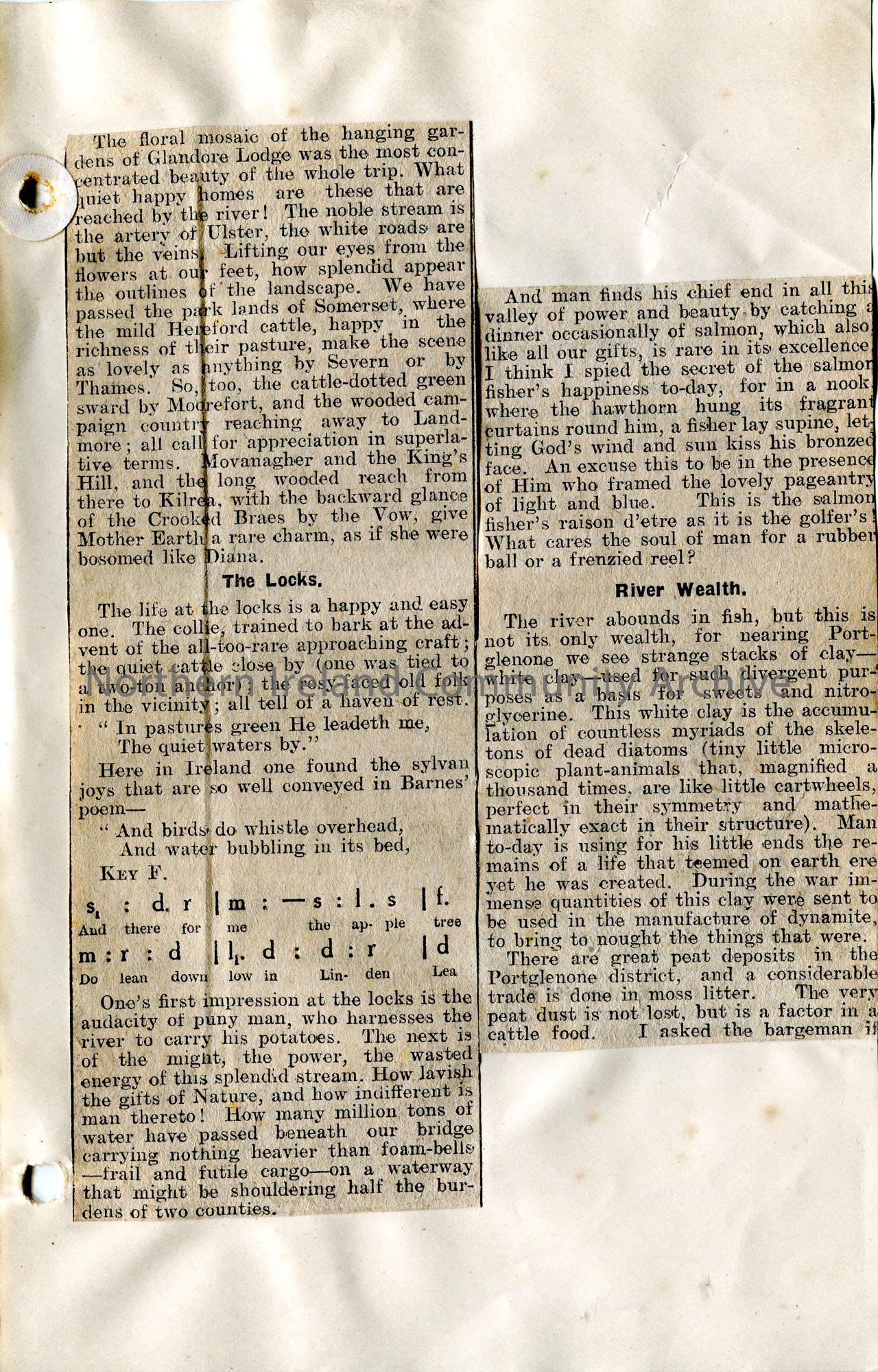 Page 2 of 3. Article cut from newspaper and pasted to page. Titled, 'Southward Ho! A River Voyage in the Potato Barge "Hibernia"'. By Sam Henry. Re a journey on a barge along the River Bann, starting at Coleraine Quay, passing the Cutts, park lands of Somerset to Portglenone. Refers to flowers and bird life along the way.