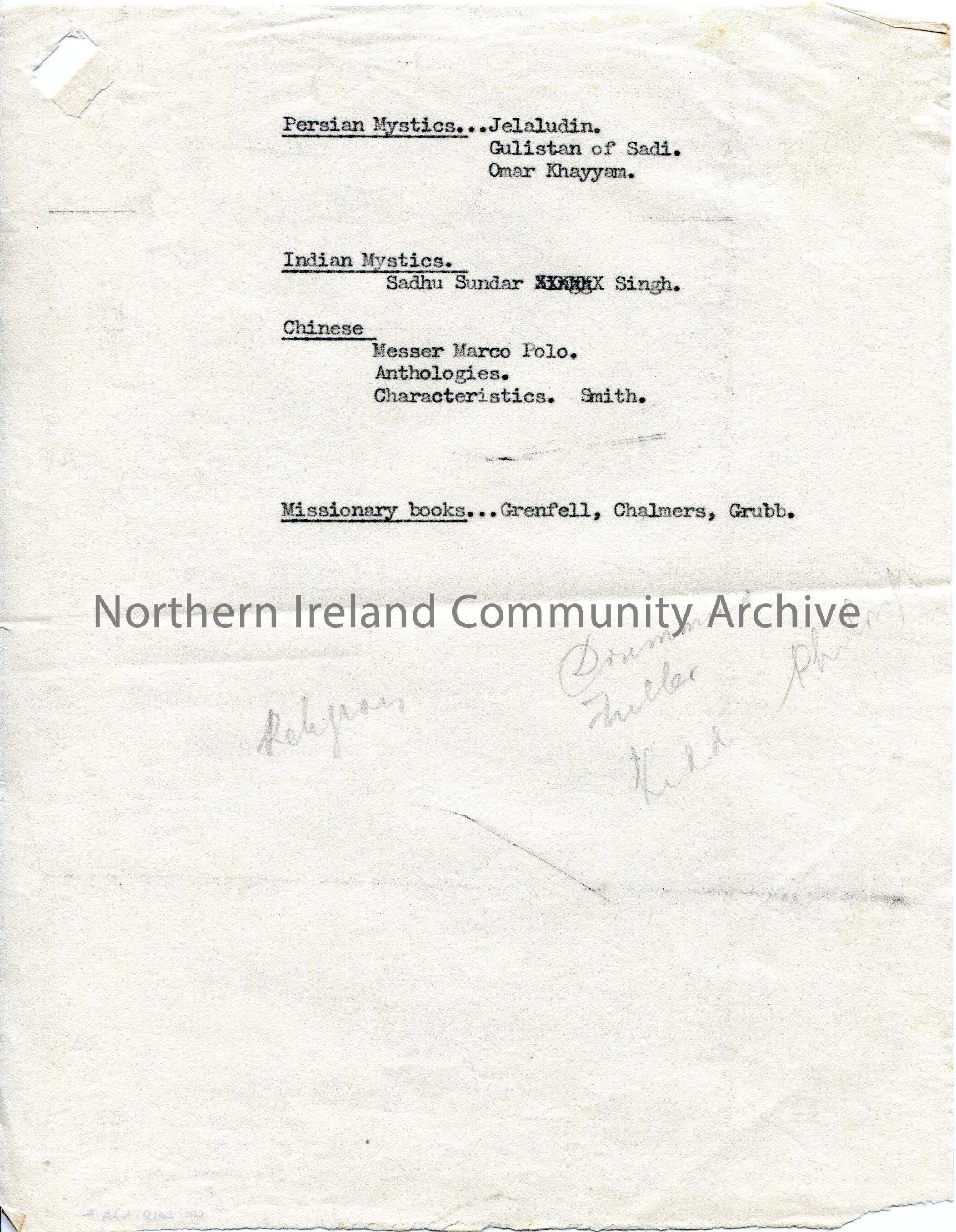Page 2 of 3. Carbon copy of CM:2018:423.1-3. Typed lists with the following headings - Standard poets, fiction, humourists, modern poets, ancient Irish, folk lore, persian mystics, indian mystics, chinese, missionary books, in youth, nature writers, American Australian.