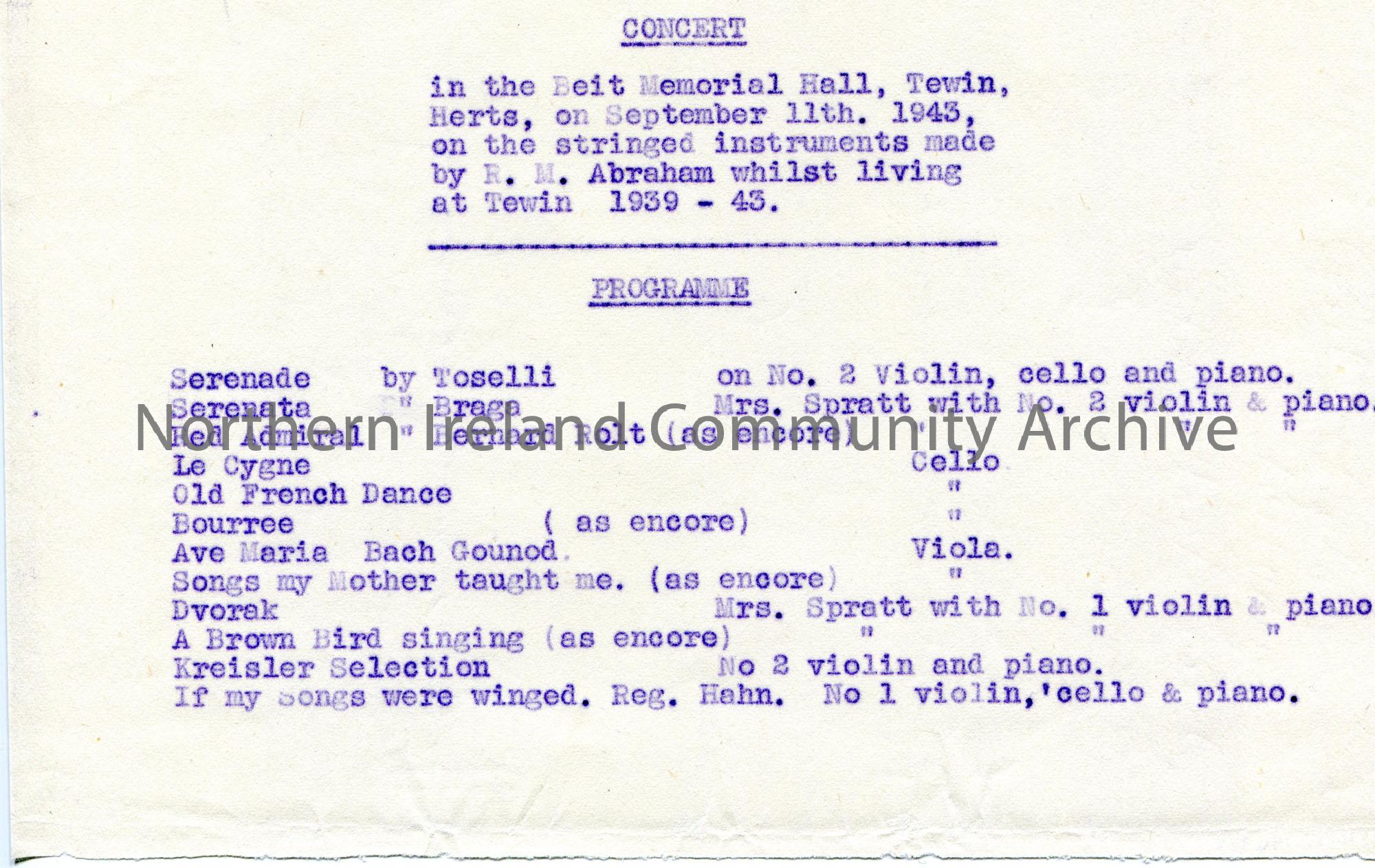 Page 2 of 3. Copy of a typed extract from the 'Hertfordshire Mercury' dated Friday 17th September, 1943. Titled 'Tewin Memorial Concert. Tribute to Violin Maker'. Re Mr R. M. Abraham. Mentions his life and work. The instruments in the concert were made by Mr R. M. Abraham. Details the concert programme.