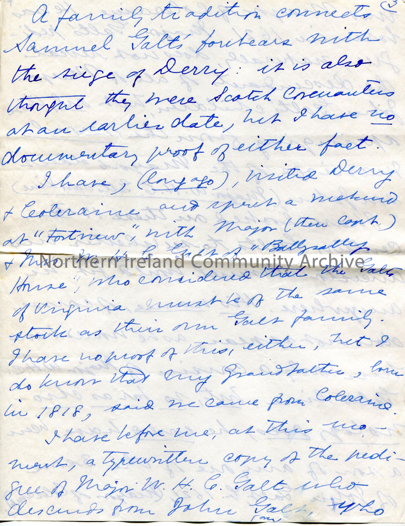 Page 2 of 3. Handwritten letter (double sided) to 'His Honour The Mayor of Coleraine County Londonderry'. Asks for the letter to be passed to a genealogist or other 'suitable person'. Seeks help in the ancestry of his great great great grandfather, Samuel Galt. Mentions a connection with Mrs Galt of Ballysally House, Coleraine and Mayor of Coleraine, John Galt. Diagram of family tree which features name Galt, Hezlett, Martin, Moore, Lennox and Hall. Asks for more information re John Galt's ancestry.