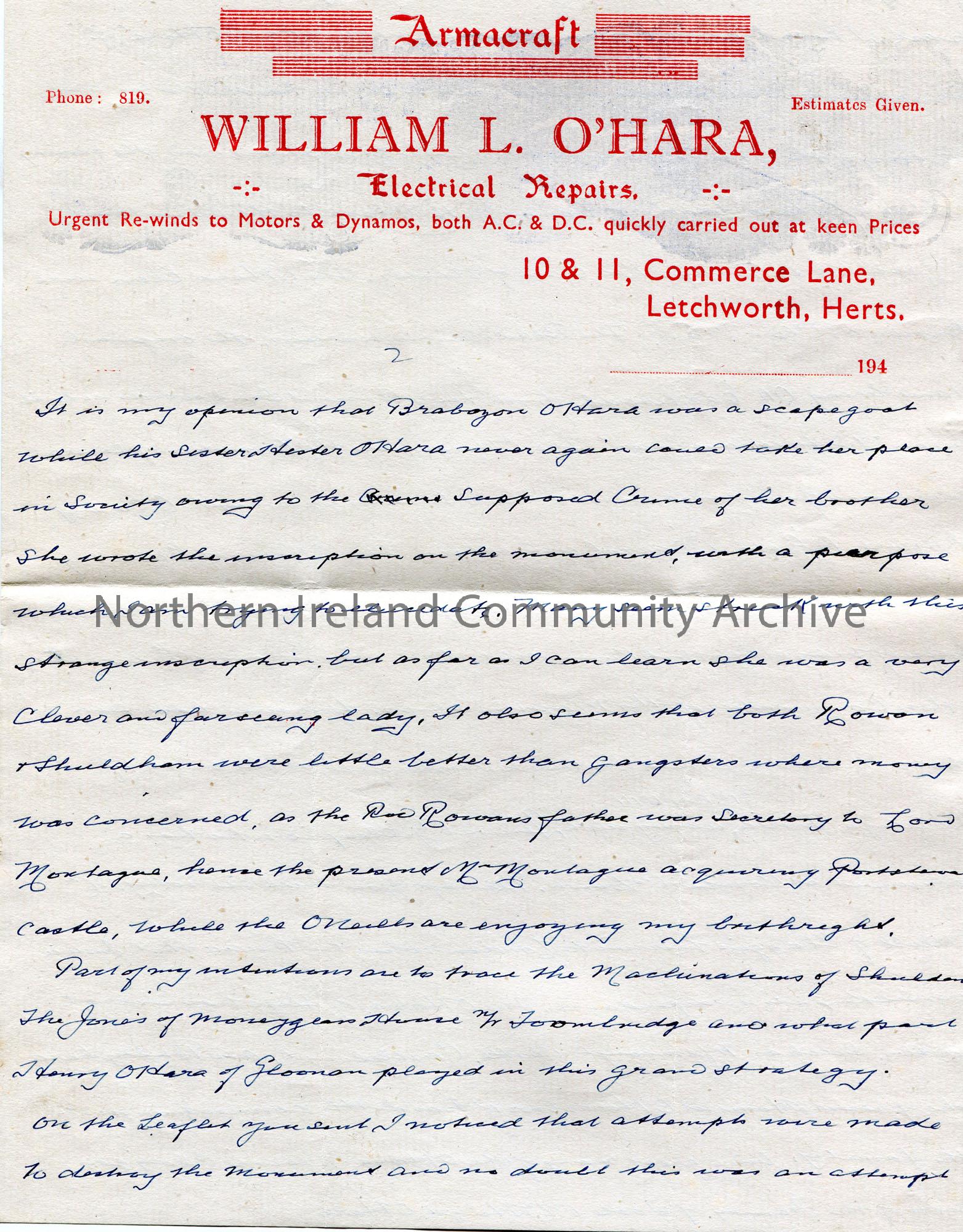 Page 2 of 3. Handwritten letter (double sided) to Sam Henry, Coleraine. Writing re the O’Hara family history. Mentions their previously owned estates …