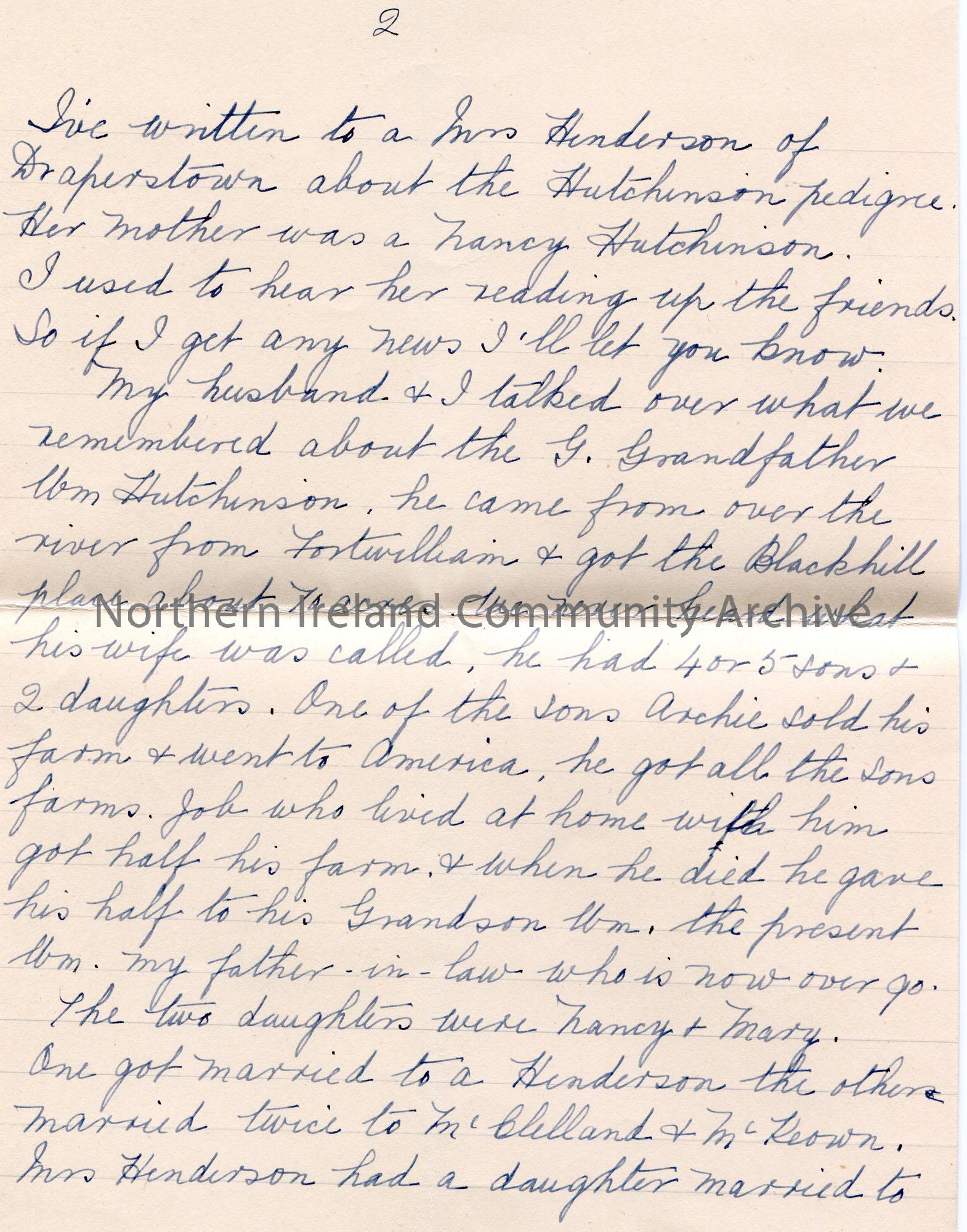 Page 2 of 3. Handwritten letter on lined paper to Sam Henry. Writing re the Sinclair Arms which Sam had sent her. Sam to contact Rev Jackson to get records of the Jacksons. Details the Hutchinson pedigree. Notes, not in context, handwritten in pencil on back of last page.