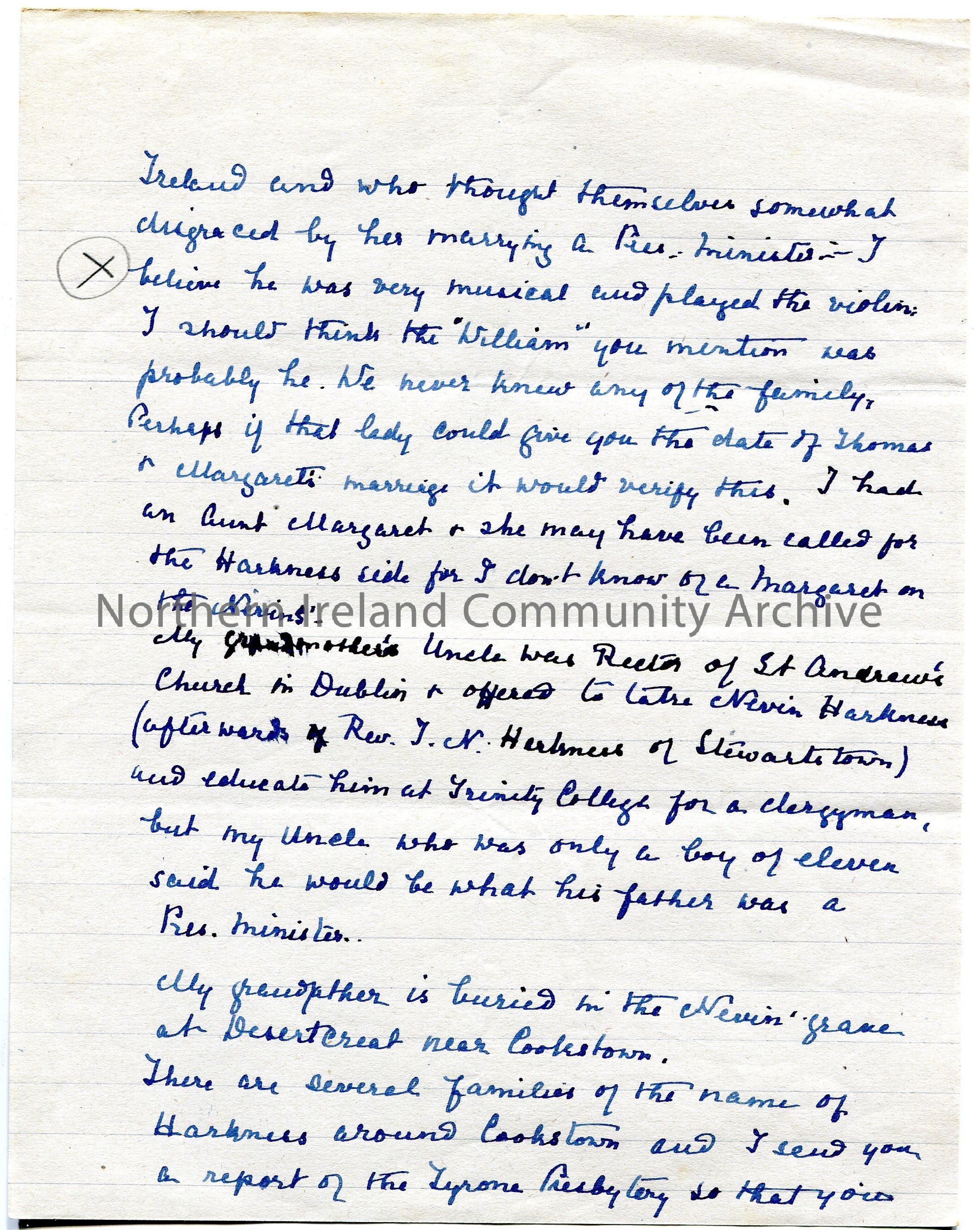 Page 2 of 3. Handwritten letter to Mr Henry. Provides details of their family history for Sam’s research re Fosters. Some points are marked with an ‘X…