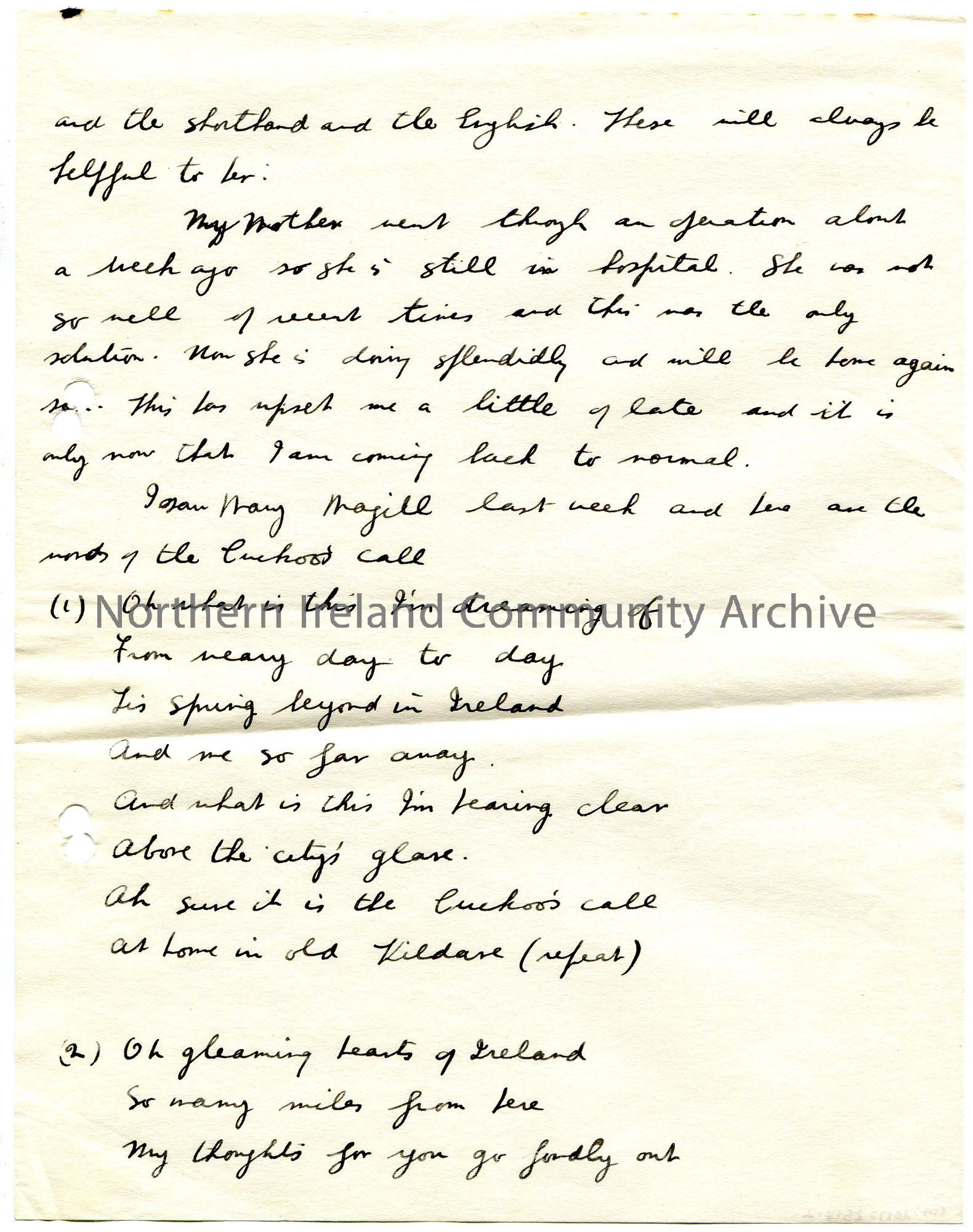 Page 2 of 3. Handwritten letter to Mr Henry. Writes of his appointment as assistantship at Nelson Memorial Church on the Shankill Road. Thinks Olive [Sam's daughter] is wise to keep music, shorthand and English. Writes that his mother is now well after her operation. Includes two verses of song 'The Cuckoo's Call' from Mary Magill. His brother thought Sam's photographs of Ballygawley were good. Writes that he shares his room with a Roman Catholic which 'will keep my Protestantism up to the mark'. Gives regards to Mrs Henry and Hetty, the Henry's maid.