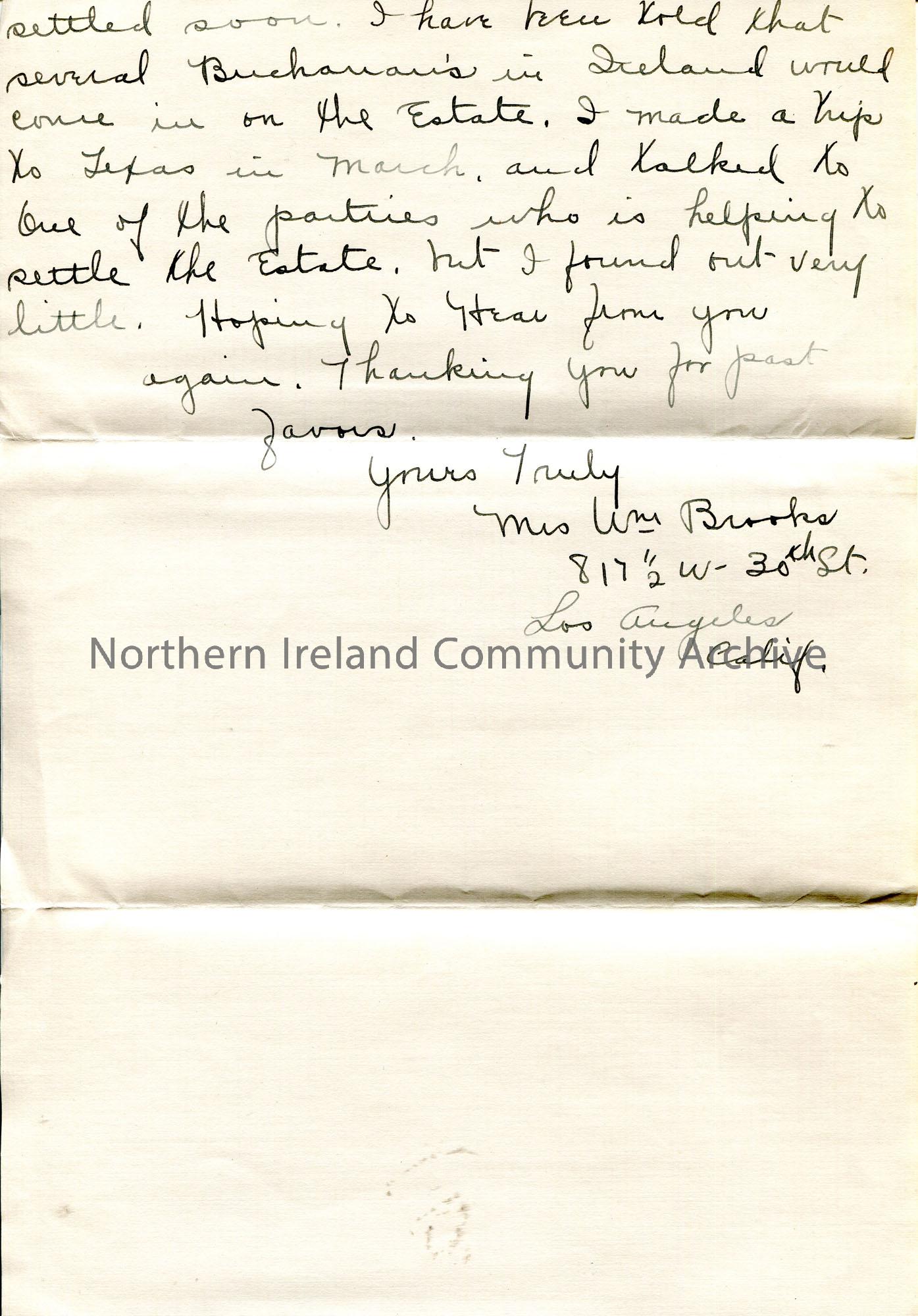 Page 2 of 3. Handwritten letter to Sam Henry from Mrs William Brooks. Writing re a Buchanan estate.