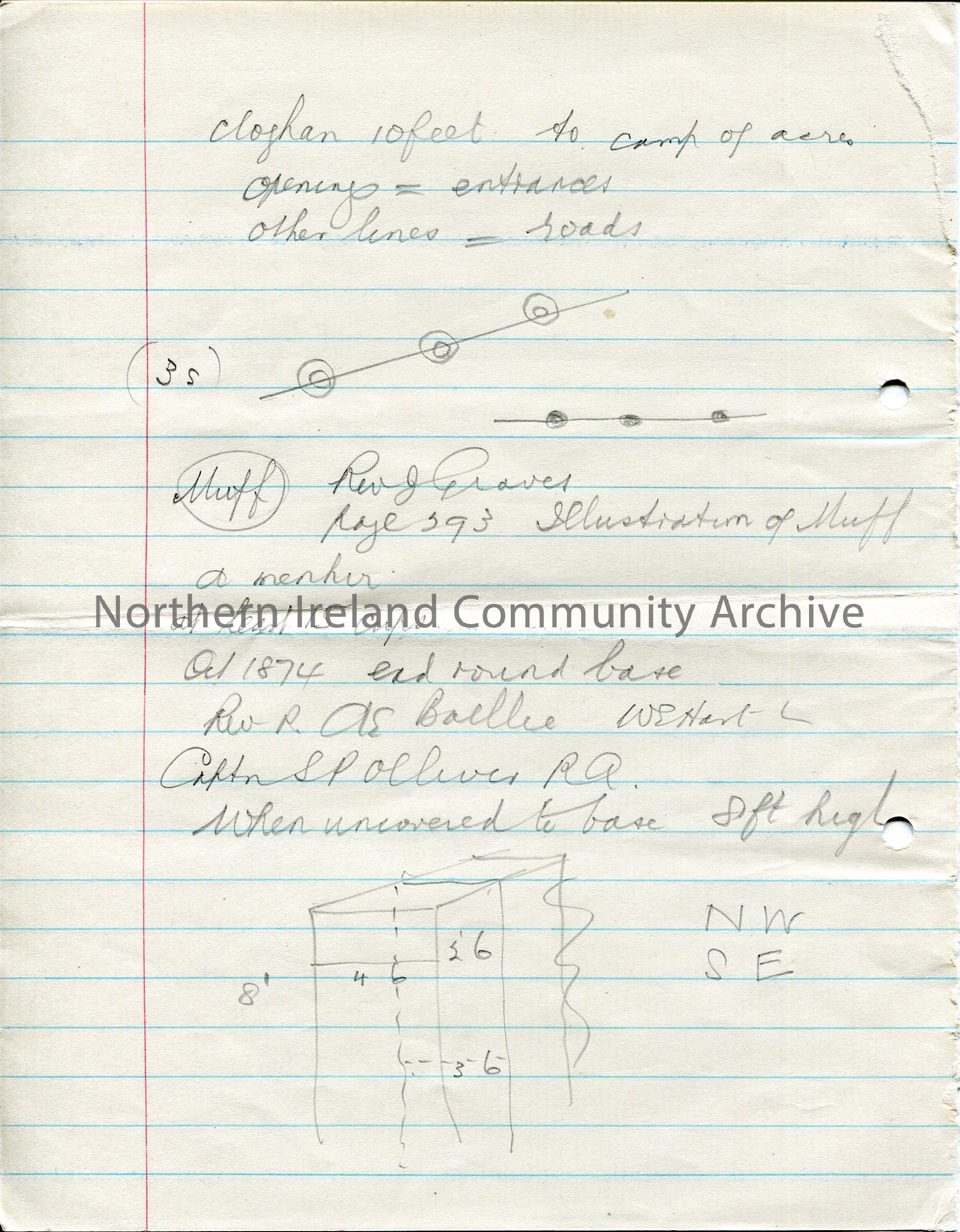 Page 2 of 3. Handwritten notes in pencil on lined paper taken from ‘Cup & Circle Sculptures, Rev. James Graves, Kilkenny, Archaeological Society, Vol….