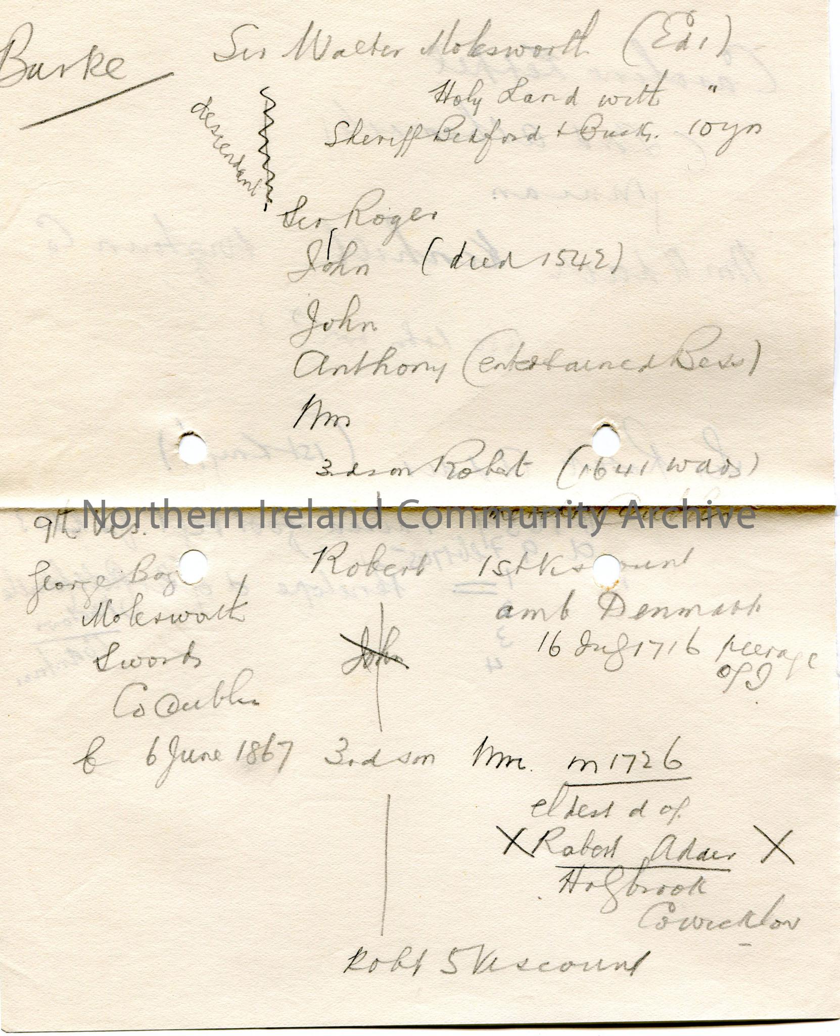 Page 2 of 3. Handwritten notes in pencil re Dublin broadcast re Robin Adair. Mentions Eileen Aroon, Caroline Kepple, Sir Robert Adair, Burke, Sir Walter Molesworth. Family tree on back of page 2.