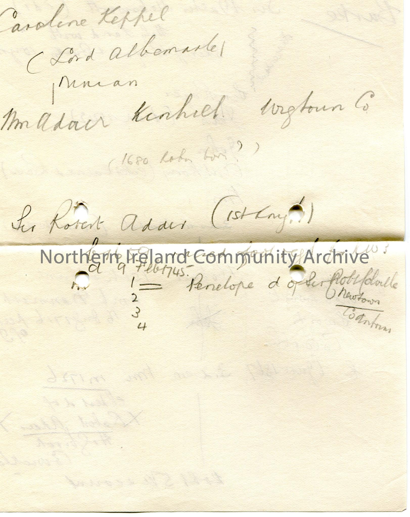 Page 2 of 3. Handwritten notes in pencil re Dublin broadcast re Robin Adair. Mentions Eileen Aroon, Caroline Kepple, Sir Robert Adair, Burke, Sir Walter Molesworth. Family tree on back of page 2.
