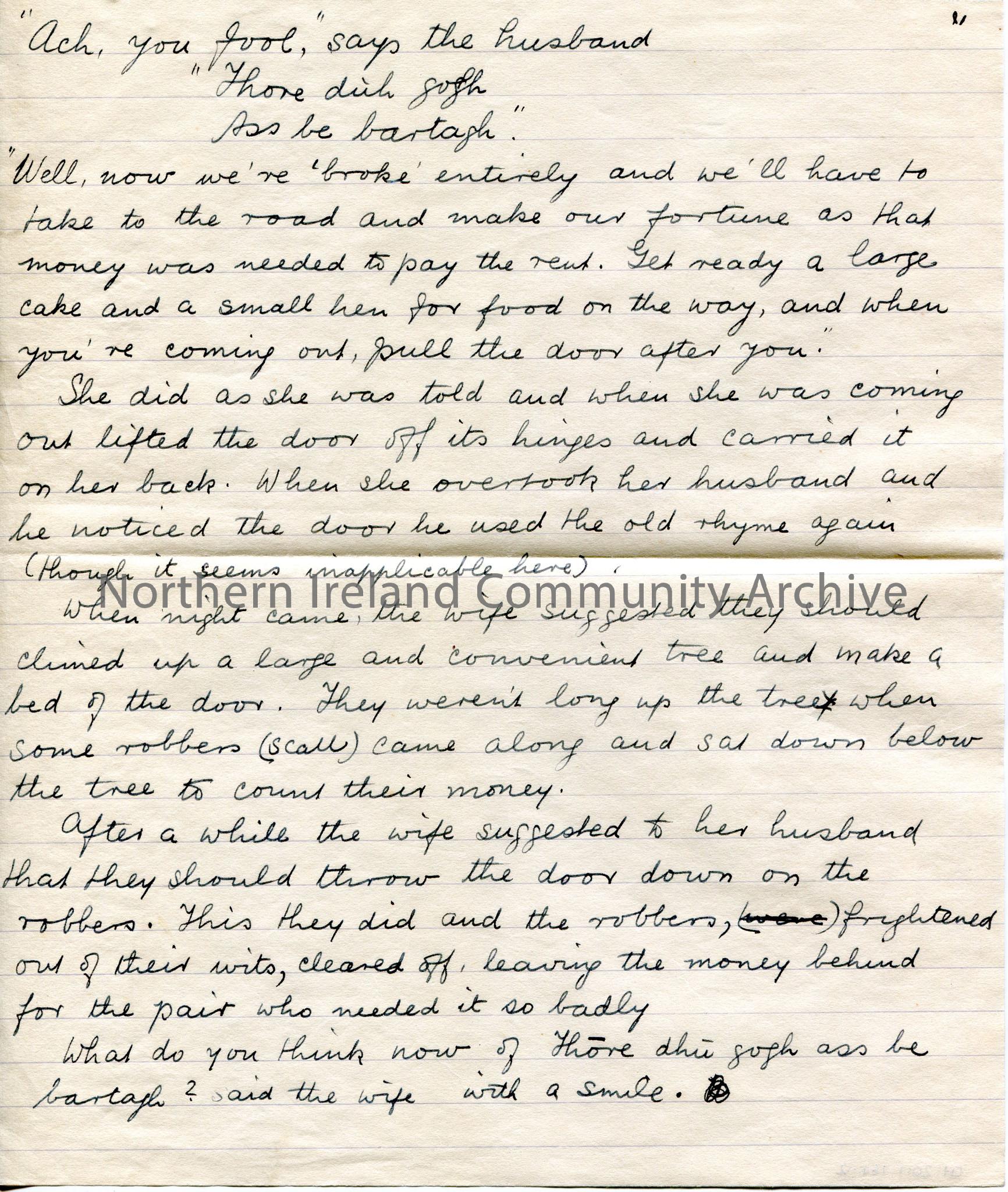 Page 2 of 3. Handwritten story which the writer seems to have translated from Gaelic and is unsure of certain words. Story re a husband and wife and a…
