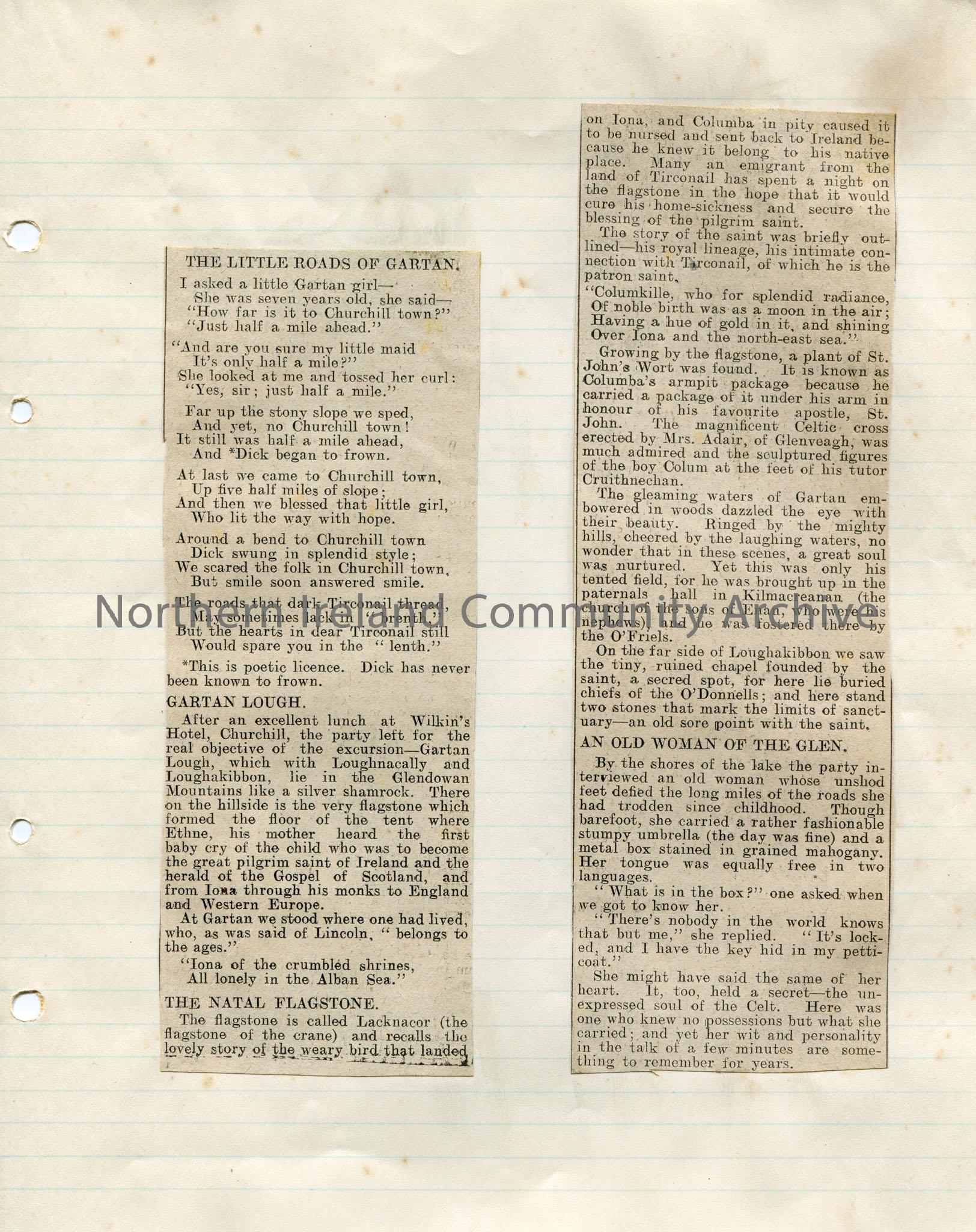 Page 2 of 3 of newspaper cuttings stuck to lined paper. Titled, 'Route Naturalists' Field Club. To Gartan and Beyond. A Memorable Excursion.' Describes the history of the places visited. Mentions the parish of Conwall, Gartan, Churchill, Lacknacor natal flagstone, barefooted woman, Doonrock, O'Donnells, Leannan river and Lough Swilly. Contains poem titled, 'The Little Roads of Gartan.' Photographic image on page 3 captioned, 'Doon Well'.