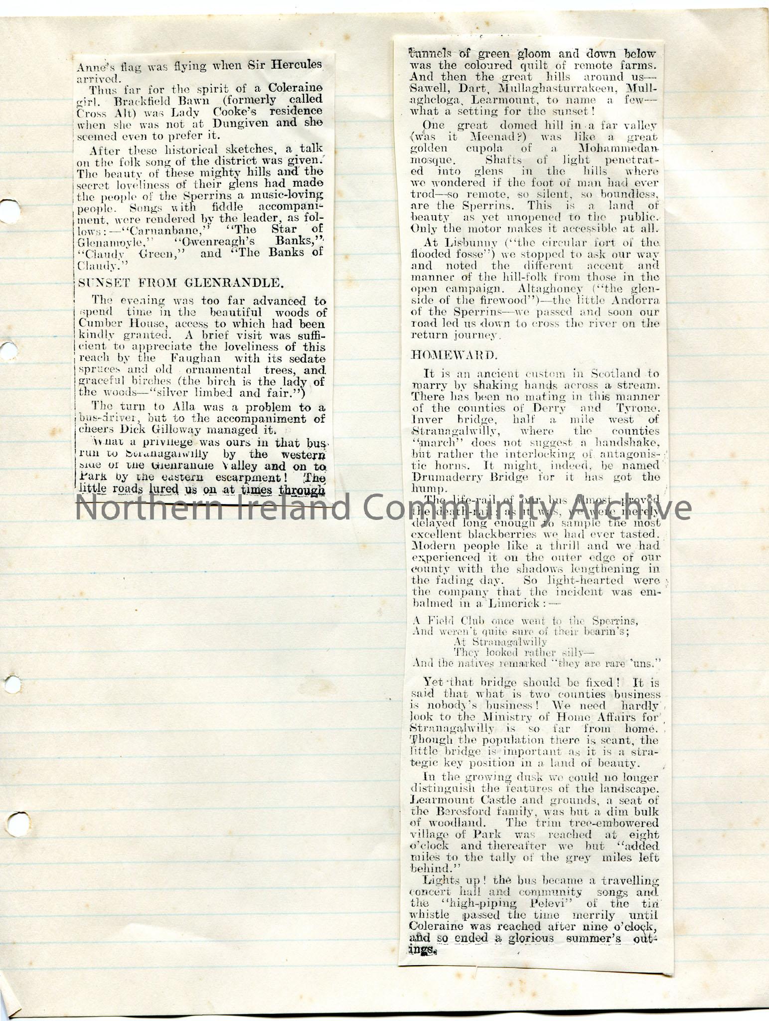 Page 2 of 3 of newspaper cuttings stuck to paper titled, ‘A Day in the Sperrins. Churches of Faughanvale. Sunset at Stranagalwilly.’ Re a trip by the …