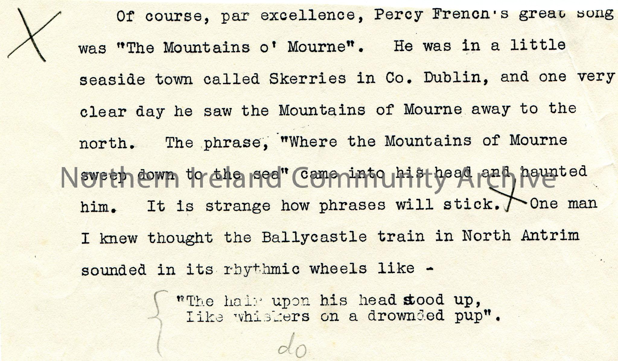 Page 2 of 3 of parts of a rough typed script for broadcast re Percy French. Annotated in pencil.