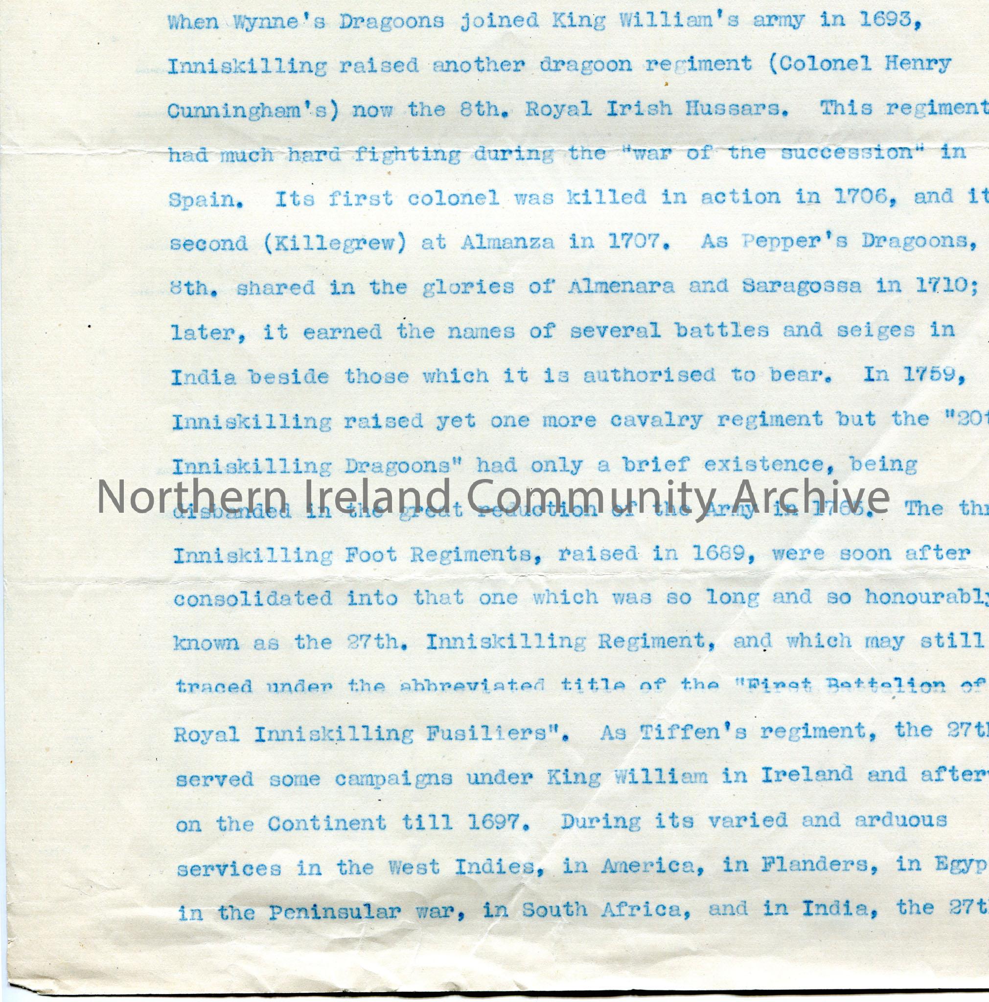Page 2 of 3 of typed extract titled, 'The Enniskillen Regiments of Horse and Foot'. Extract from the Army and Navy Gazette, 18th August, 1883 from the MS Record of Services of the 27th Inniskillings preserved in the Regimental Museum. An early history of the Royal Inniskilling Fusiliers 1600-1800.
