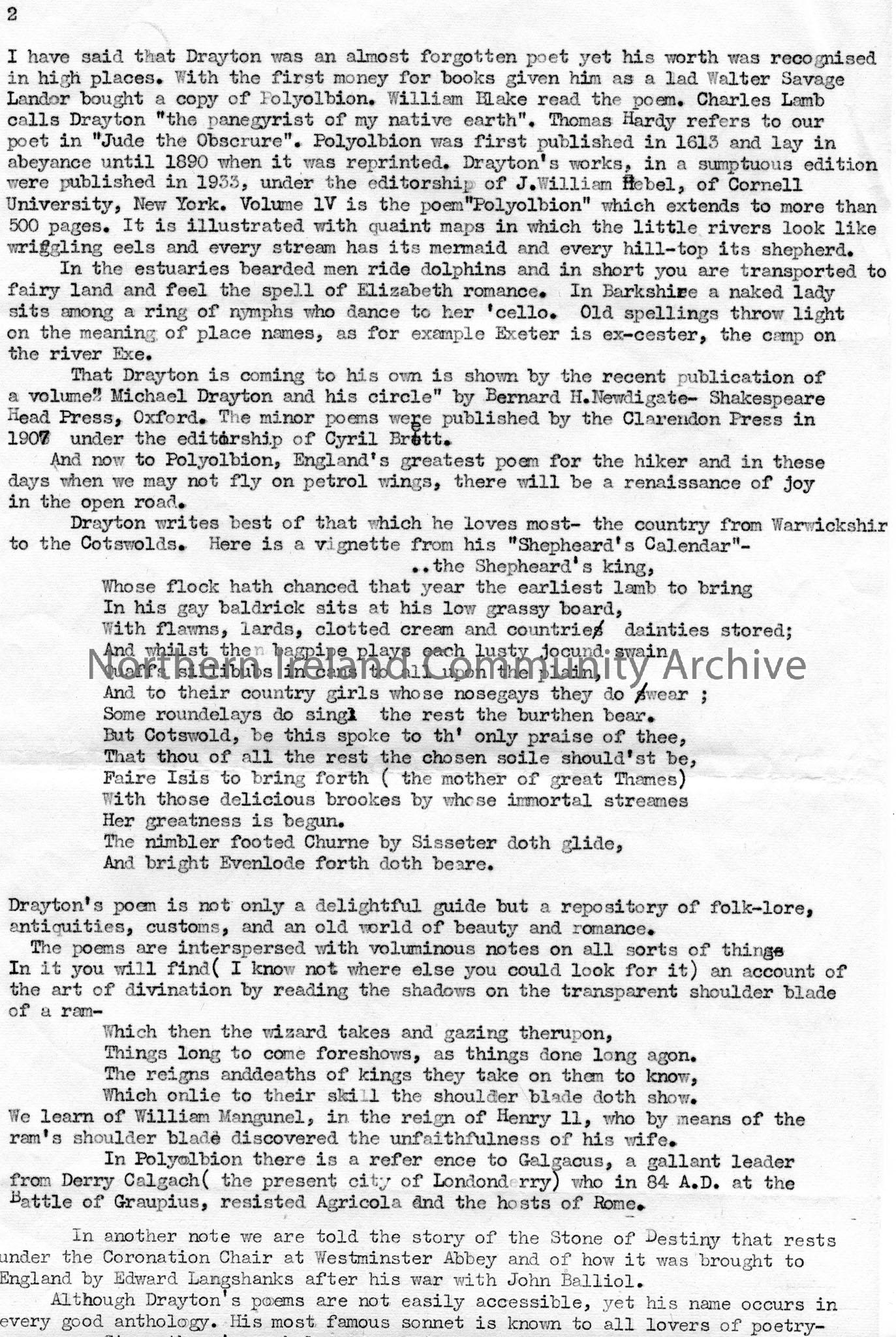 Page 2 of 3 of typed script titled, ‘The Hiker’s Laureate’. Script re Michael Drayton. Descriptive script of his life and work including some of his p…
