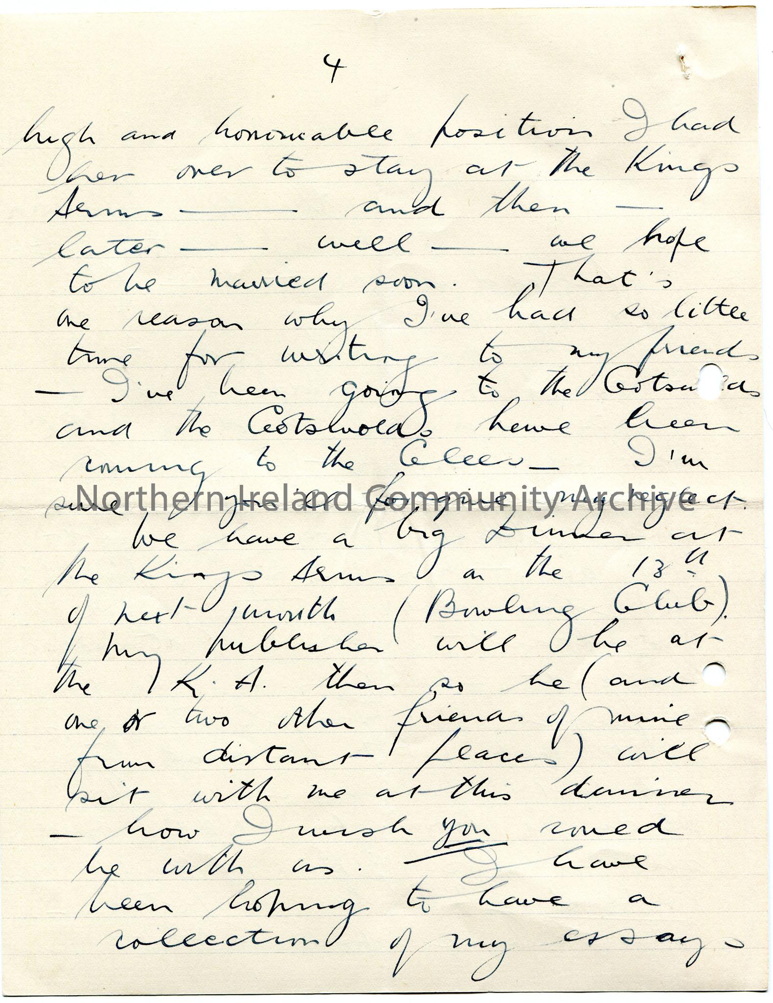 Page 2 of 3 pages, double sided, of handwritten letter to Sam Henry. Thanks Sam for good wishes for Christmas. Wishes Sam a Happy New Year. Writes it has been busy at the post office where he works. Went to Birmingham B.B.C on 23rd December to join a 'Round the Midlands' broadcast. Asks Sam if he has heard the 'Microphone at ?' programme. Evans had part in it talking to Harvey Wossall? who sang 'Peck the Peck' an old song about a cobbler and who Evans plans to meet up with to look at collection of songs.Thanks Sam for card of B.B.C appointments. Writes that he got engaged to Doris (Dot) Aldridge from Cotswold and a B.B.C folk song singer. Talks of a dinner in the Kings Arms on 13th January in which in publisher will be there. Hopes to have a collection of essays and character sketches ready to give to publisher. States that Father Rope has moved to the English College, Rome.