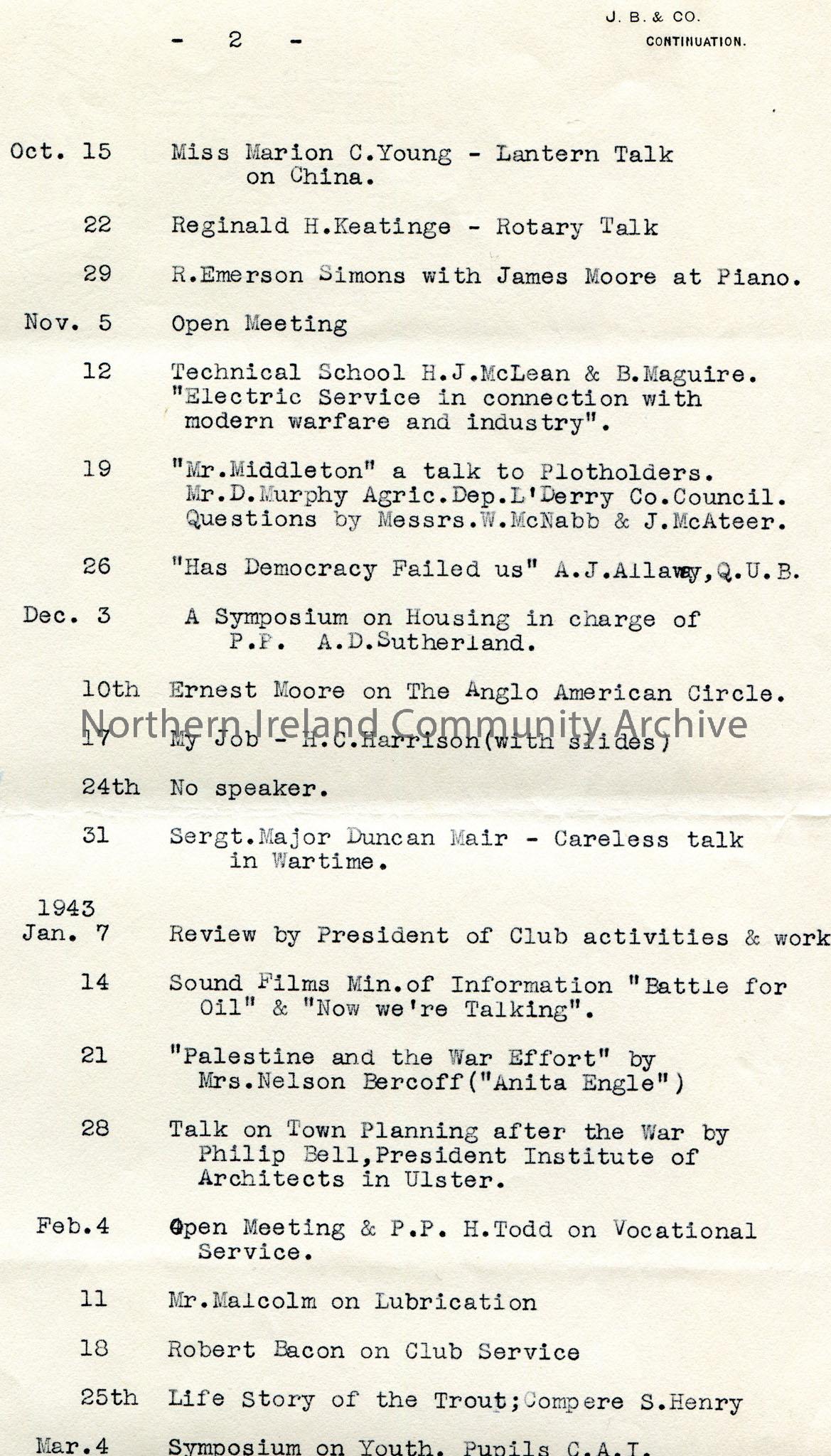 Page 2 of 3 titled ‘Coleraine Rotary Club, Luncheon Programmes From 9th April, 1942 to 27th May 1943. On reverse of last page is a form re public opin…