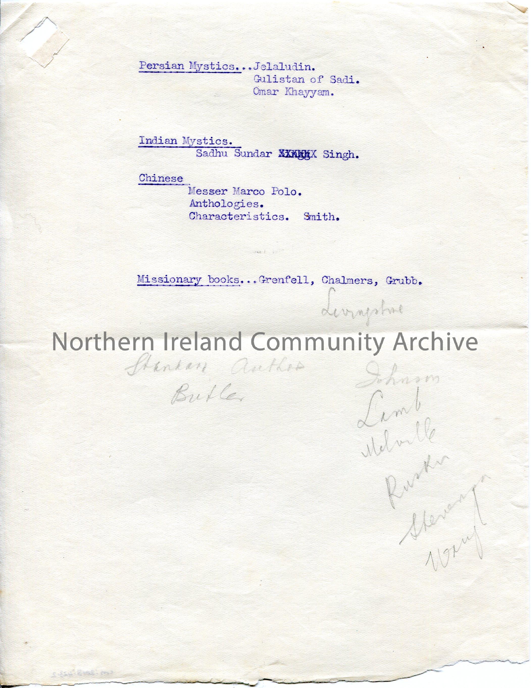 Page 2 of 3. Typed lists with the following headings - Standard poets, fiction, humourists, modern poets, ancient Irish, folk lore, persian mystics, indian mystics, chinese, missionary books, in youth, nature writers, American Australian. Rough, handwritten notes in pencil beside lists.