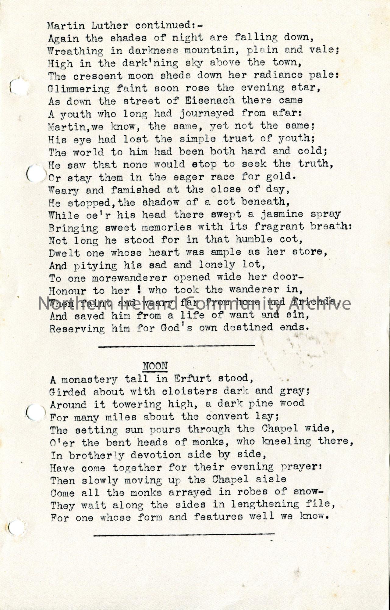 Page 2 of 3. Typed poem 'Martin Luther' by Beatrice Grimshaw, January 1884. Written in 3 sections - morning, noon and night.