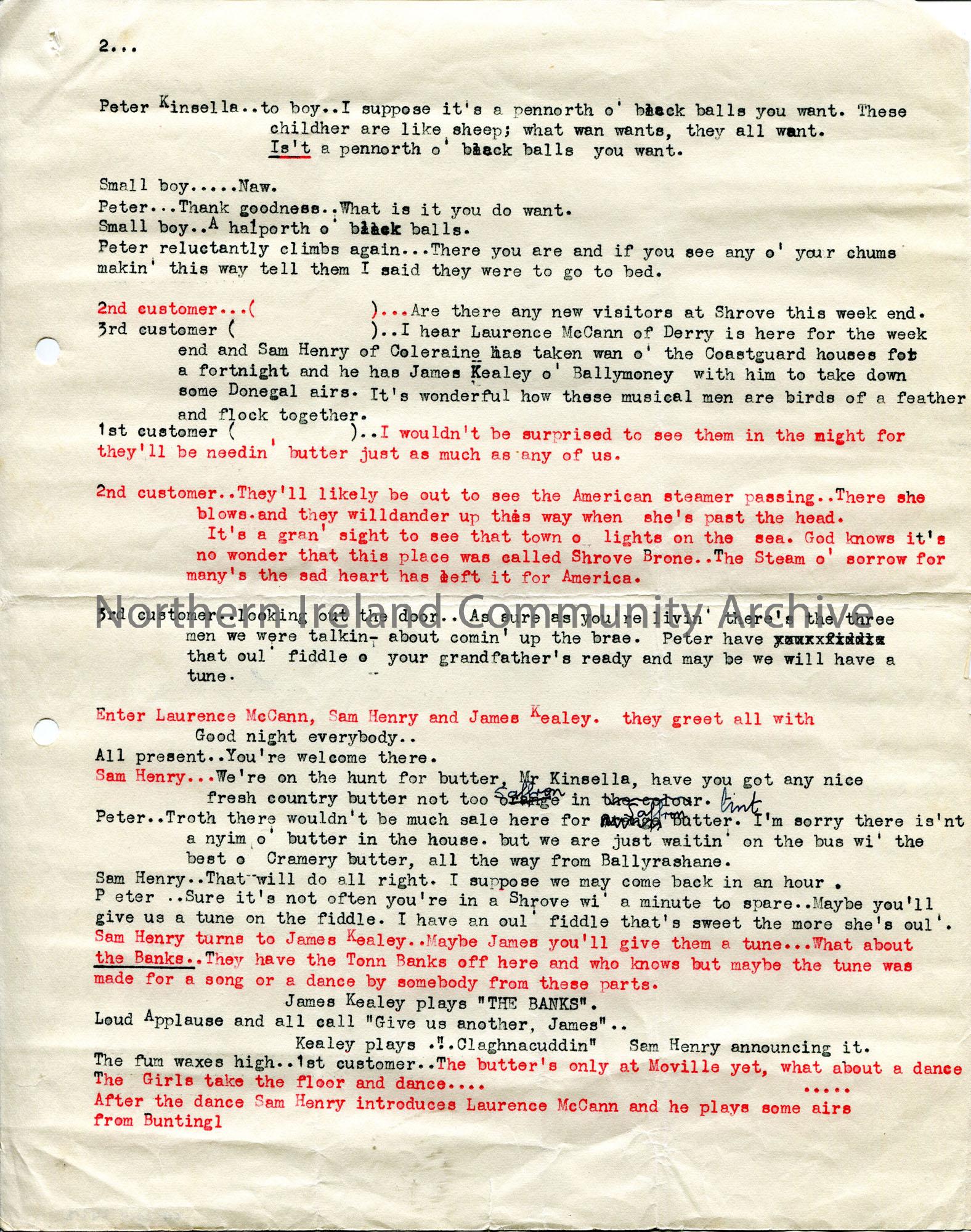 Page 2 of 3. Typed script for An Irish Ceilidh performed on 21st January, 1935 in Coleraine Town Hall. Features Sam Henry, James Kealey, Laurence McCann and Seumas Mallon. Includes singing and songs played on the violin. Re a shop scene.